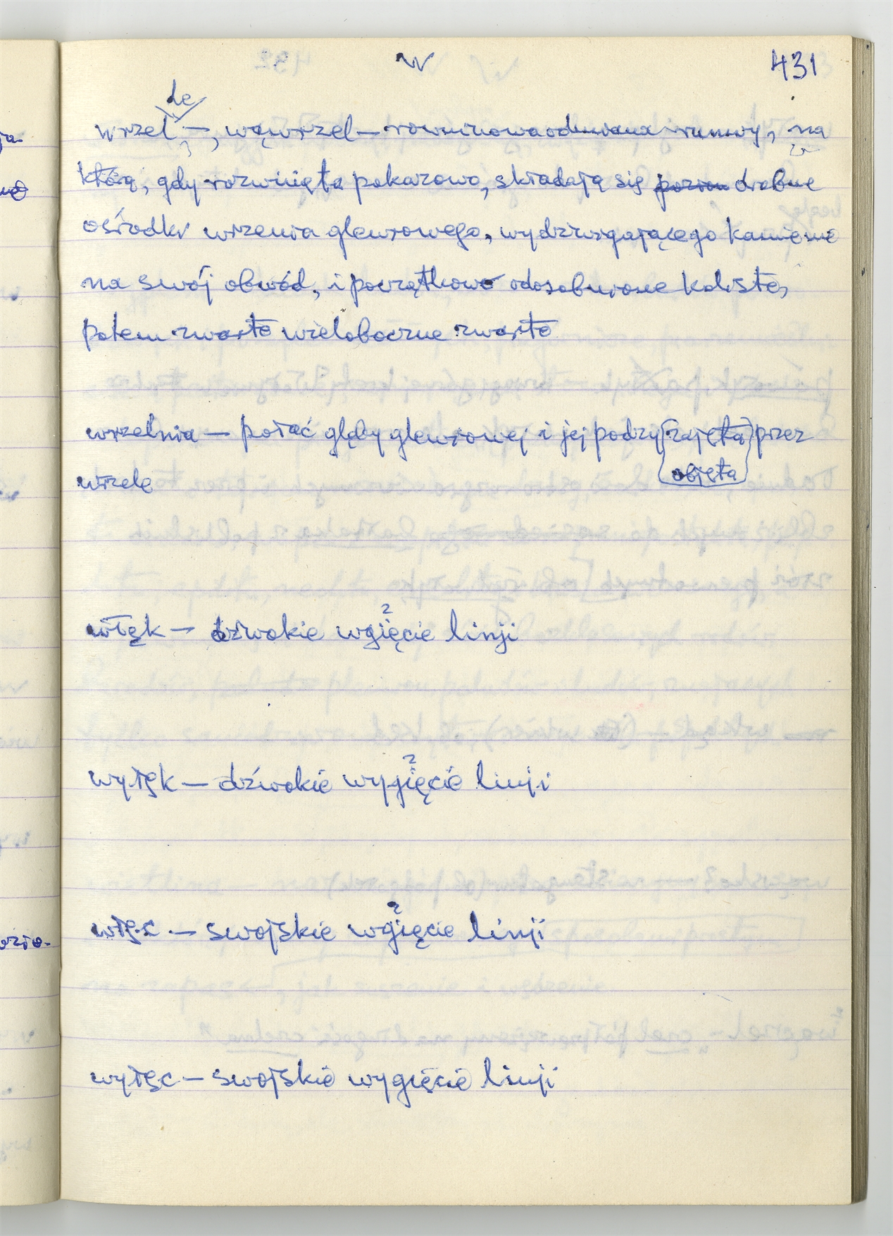 Rękopis słownika sporządzony w zeszycie w linię zatytułowany "Słownik S-Z Ż Ź s. 361-480" - strona 61: hasła słownikowe na literę W c.d. (autorska strona 431)