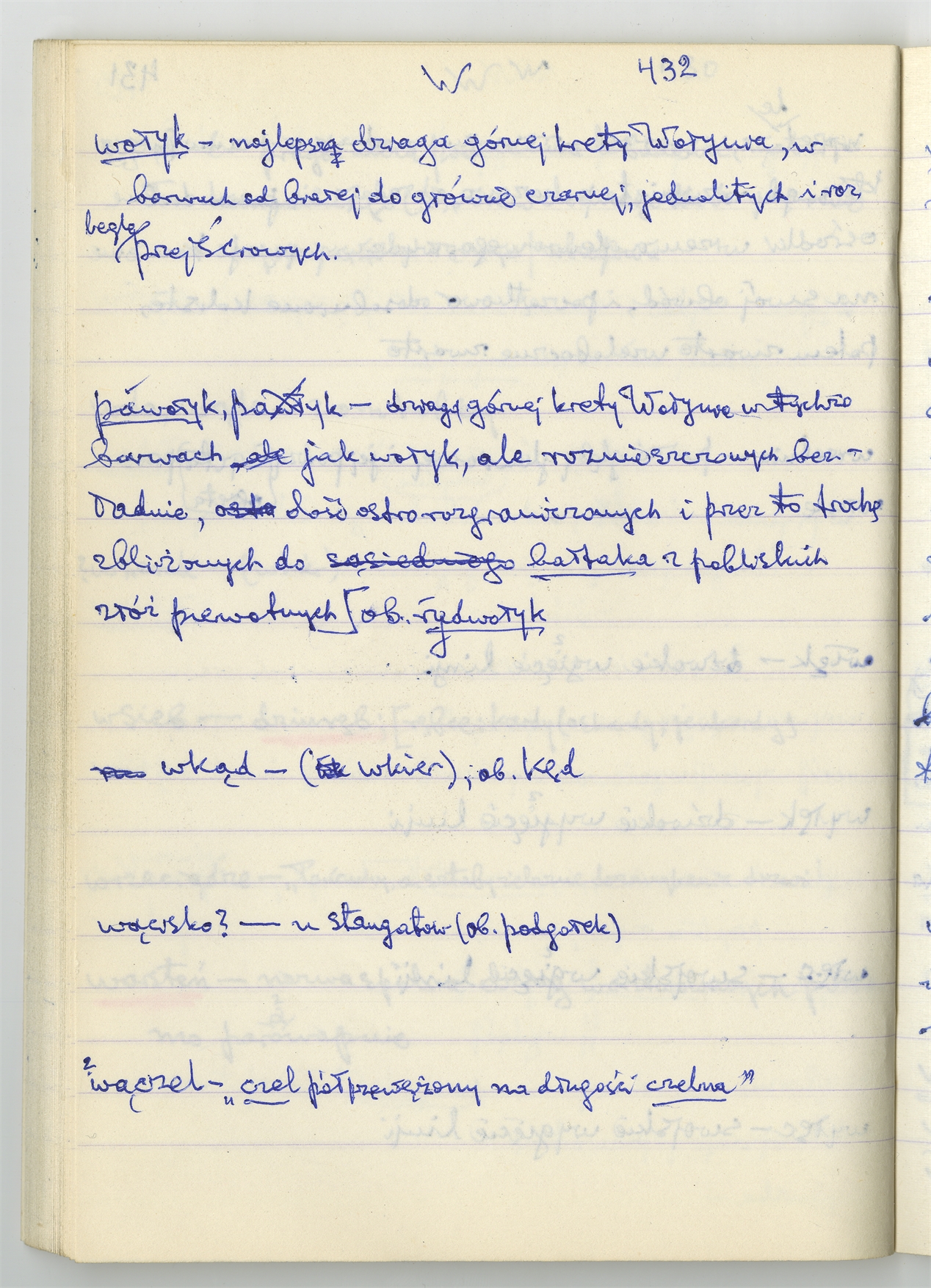 Rękopis słownika sporządzony w zeszycie w linię zatytułowany "Słownik S-Z Ż Ź s. 361-480" - strona 62: hasła słownikowe na literę W c.d. (autorska strona 432)