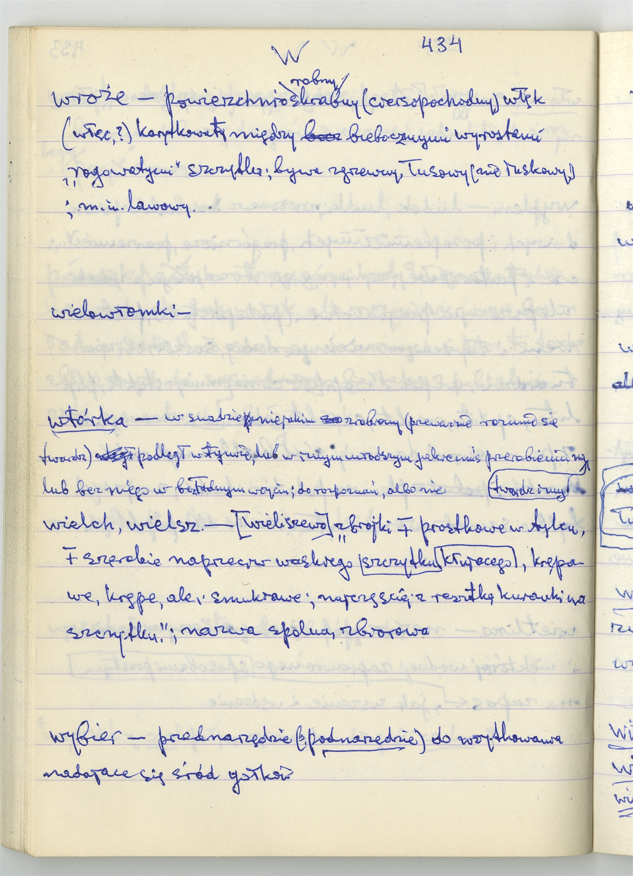 Rękopis słownika sporządzony w zeszycie w linię zatytułowany "Słownik S-Z Ż Ź s. 361-480" - strona 64: hasła słownikowe na literę W c.d. (autorska strona 434)