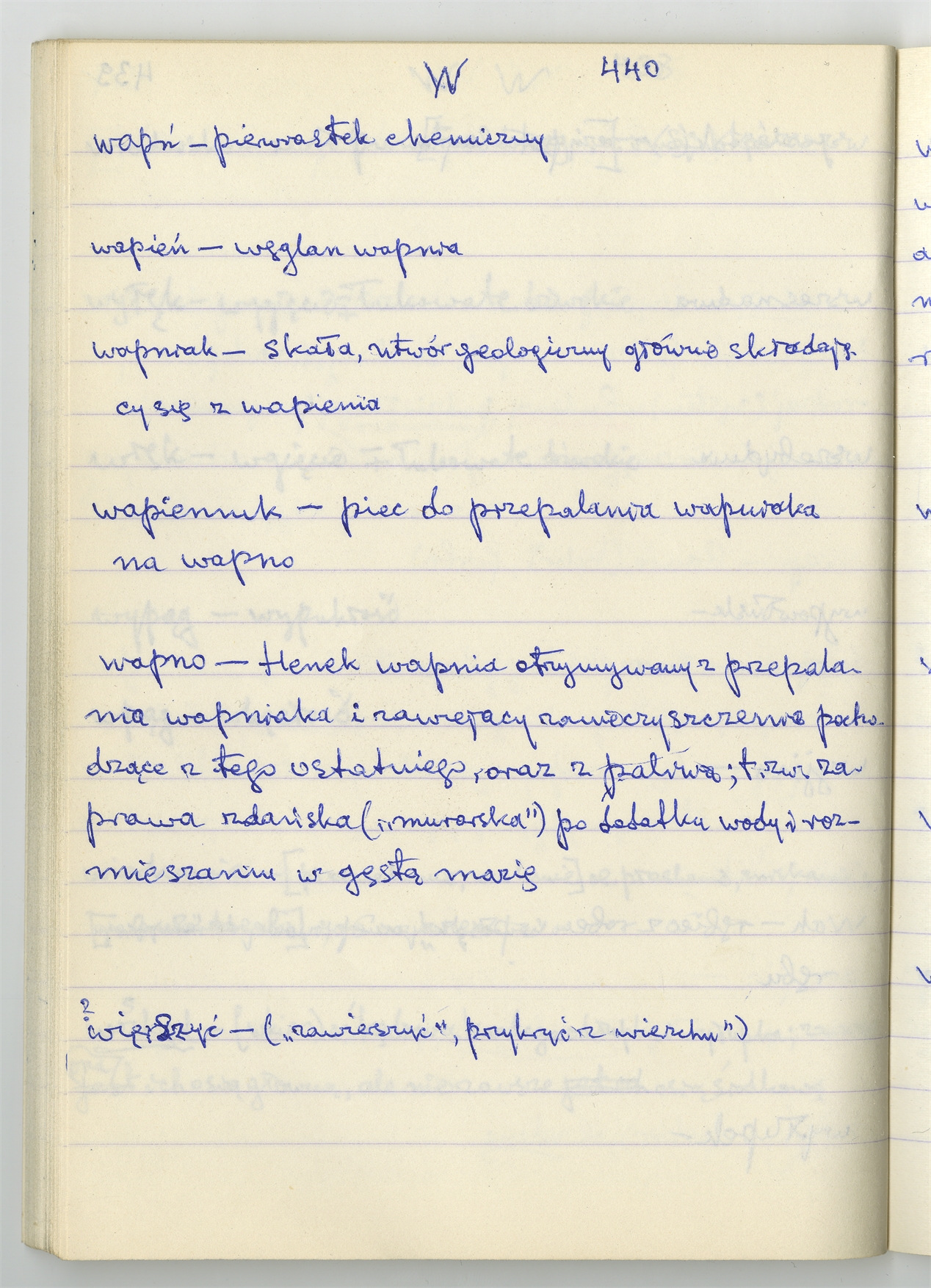 Element 70 - Rękopis słownika sporządzony w zeszycie w linię zatytułowany "Słownik S-Z Ż Ź s. 361-480" - strona 70: hasła słownikowe na literę W c.d. (autorska strona 440)