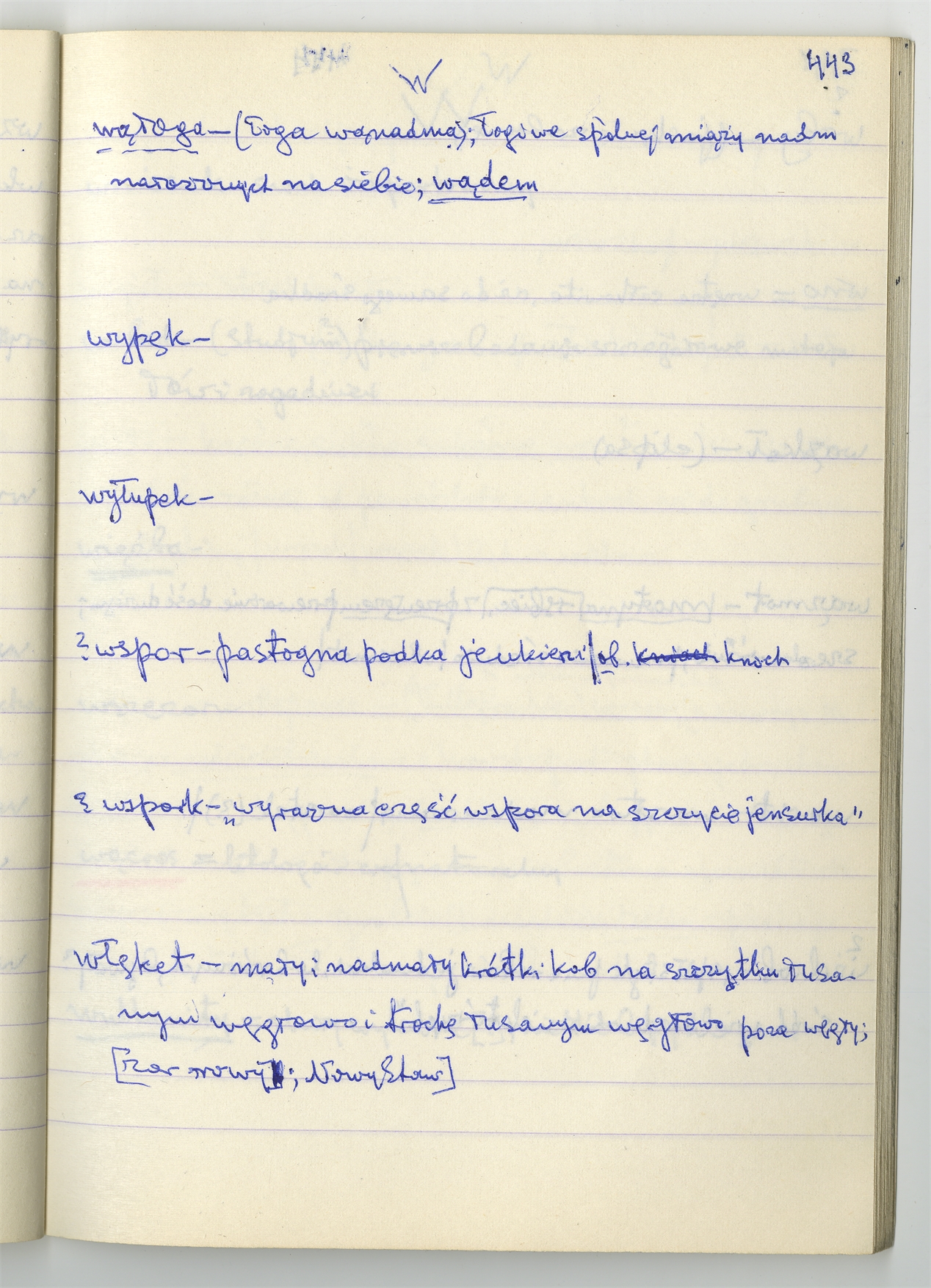 Rękopis słownika sporządzony w zeszycie w linię zatytułowany "Słownik S-Z Ż Ź s. 361-480" - strona 73: hasła słownikowe na literę W c.d. (autorska strona 443)