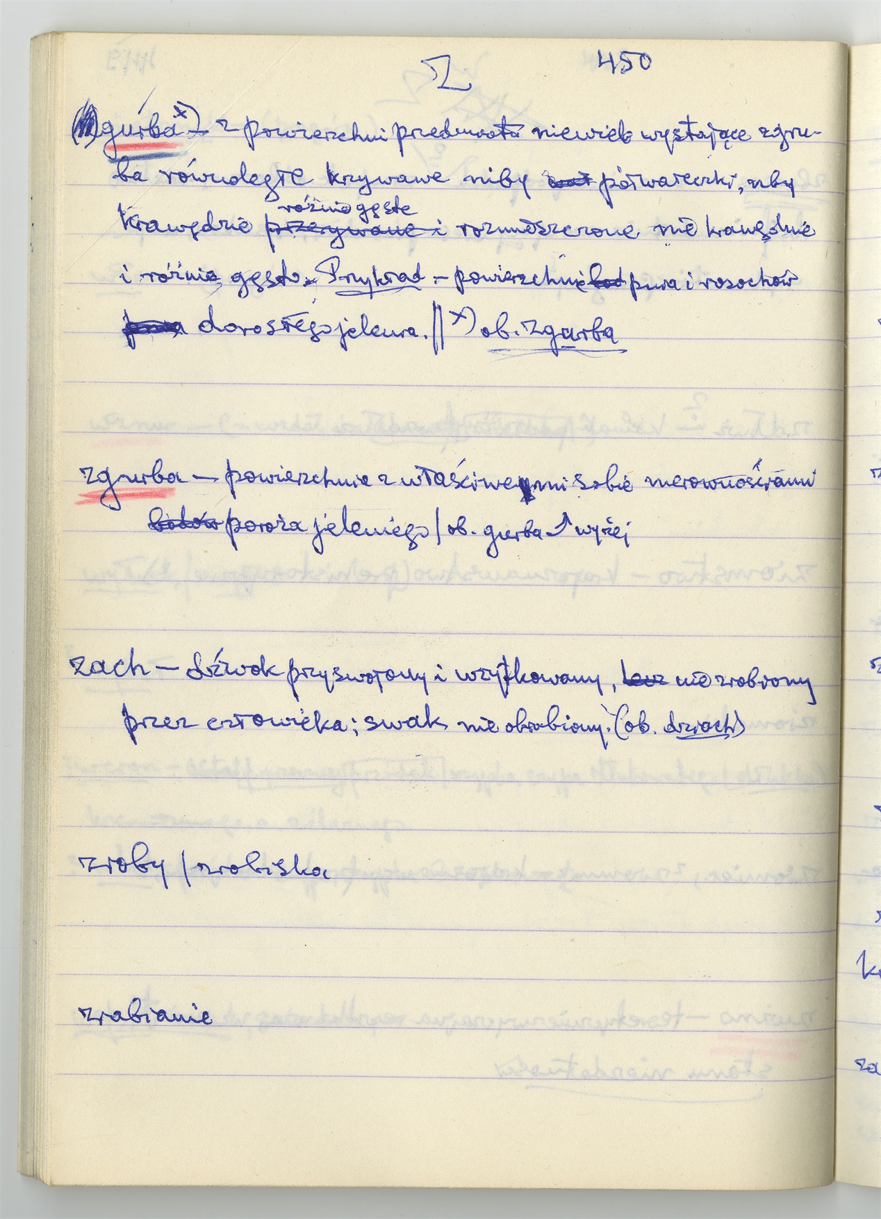 Rękopis słownika sporządzony w zeszycie w linię zatytułowany "Słownik S-Z Ż Ź s. 361-480" - strona 80: hasła słownikowe na literę Z c.d. (autorska strona 450)