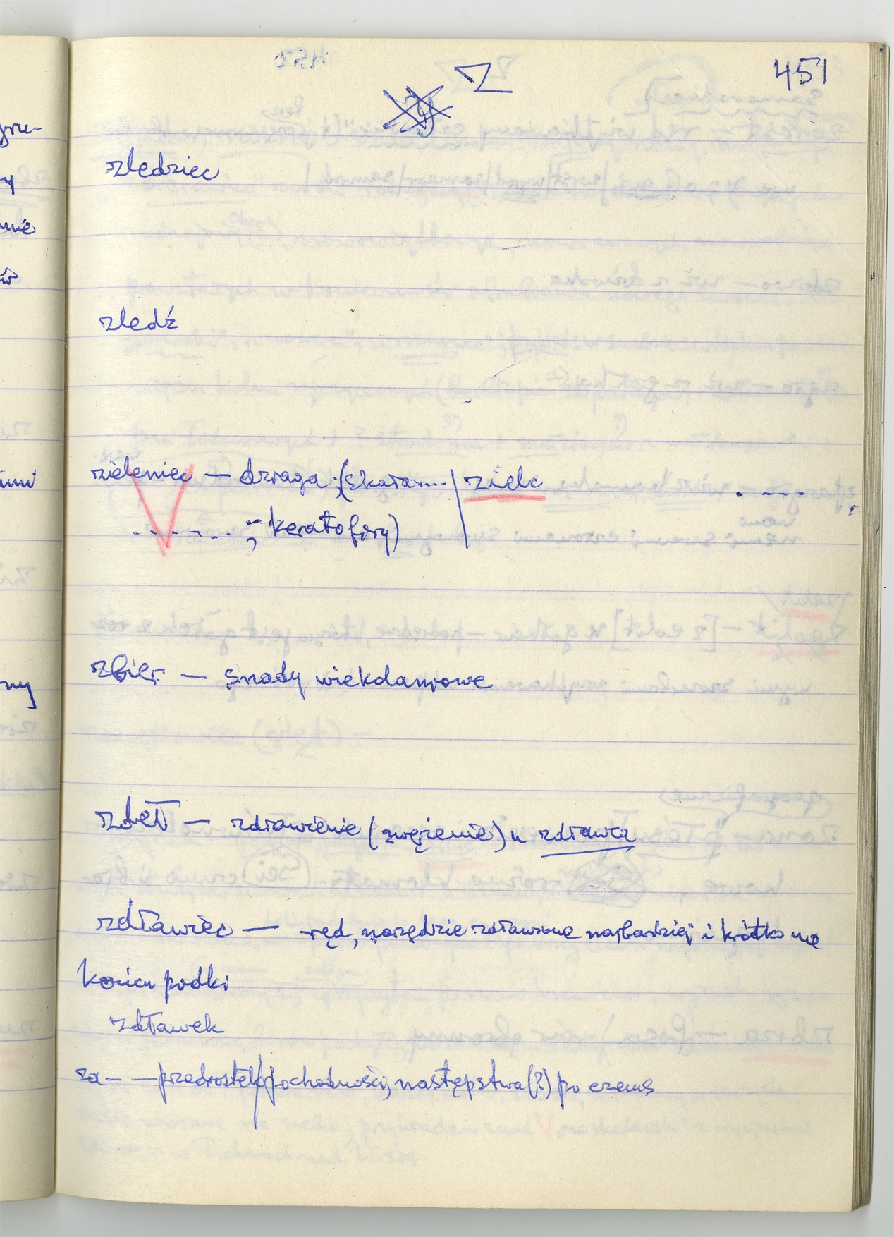 Rękopis słownika sporządzony w zeszycie w linię zatytułowany "Słownik S-Z Ż Ź s. 361-480" - strona 81: hasła słownikowe na literę Z c.d. (autorska strona 451)