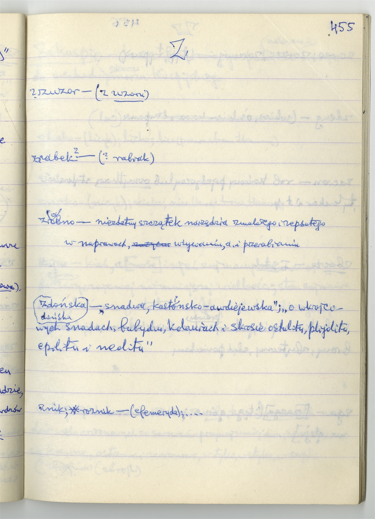 Element 85 - Rękopis słownika sporządzony w zeszycie w linię zatytułowany "Słownik S-Z Ż Ź s. 361-480" - strona 85: hasła słownikowe na literę Z c.d. (autorska strona 455)