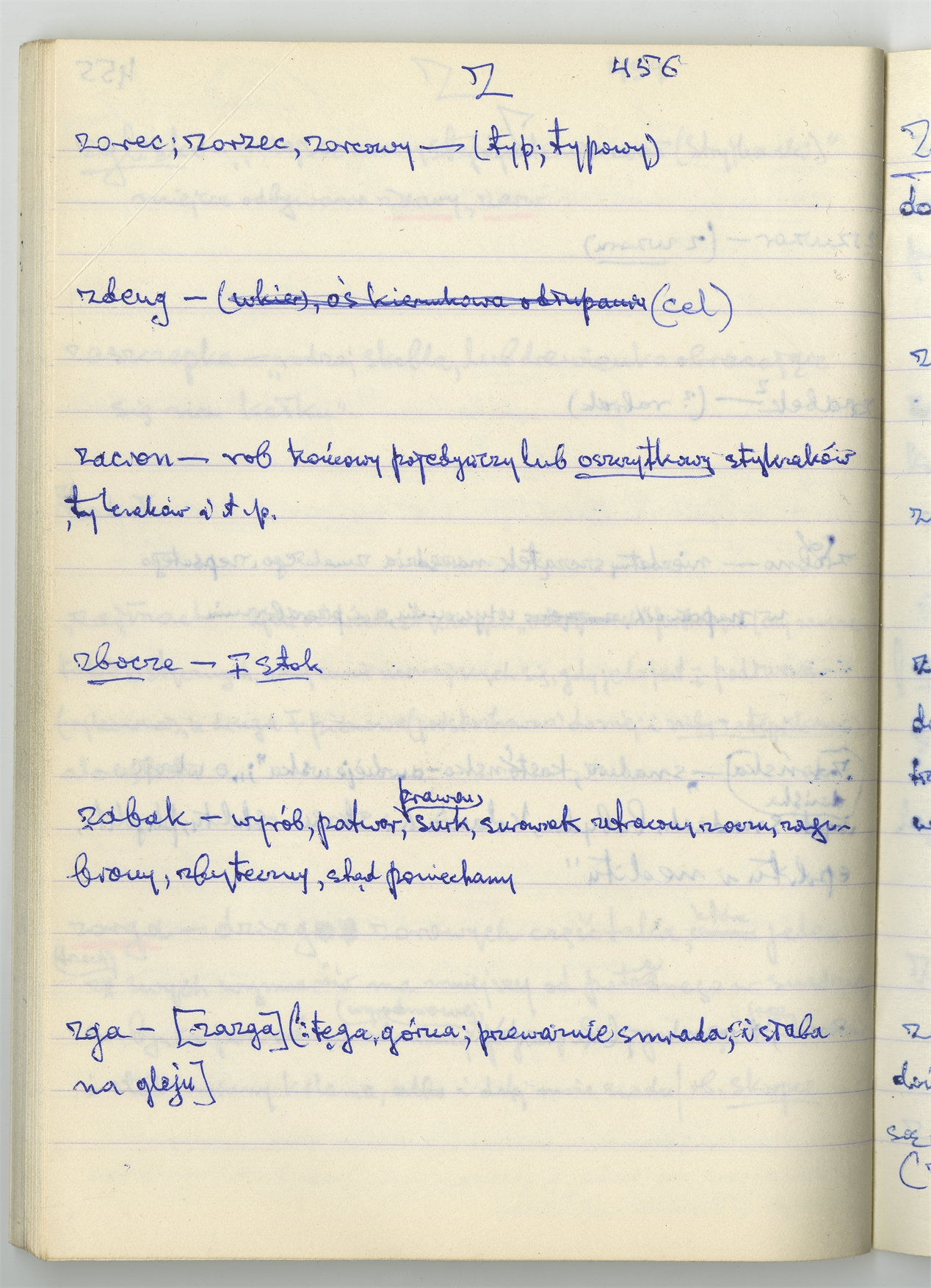 Rękopis słownika sporządzony w zeszycie w linię zatytułowany "Słownik S-Z Ż Ź s. 361-480" - strona 86: hasła słownikowe na literę Z c.d. (autorska strona 456)