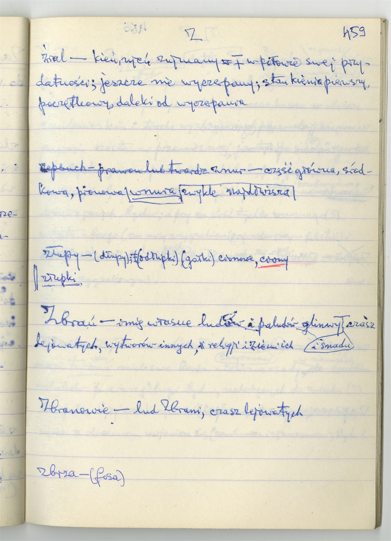 Rękopis słownika sporządzony w zeszycie w linię zatytułowany "Słownik S-Z Ż Ź s. 361-480" - strona 89: hasła słownikowe na literę Z c.d. (autorska strona 459)