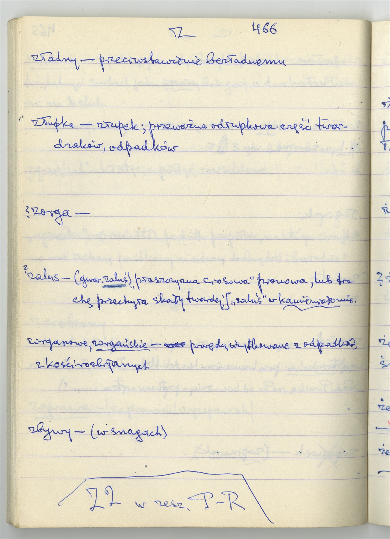 Rękopis słownika sporządzony w zeszycie w linię zatytułowany "Słownik S-Z Ż Ź s. 361-480" - strona 96: hasła słownikowe na literę Z c.d. (autorska strona 466)
