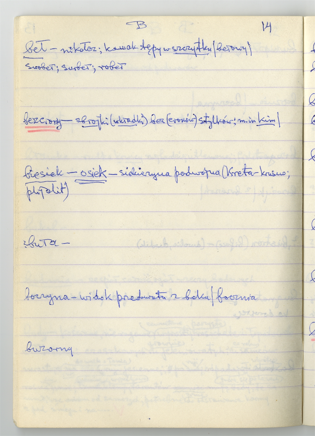 Rękopis słownika sporządzony w zeszycie w linię zatytułowany "Zumia stosowana Br. 1 A-J i D2 s. 1-120" - strona 12: hasła słownikowe na literę B c.d. (autorska strona 14)