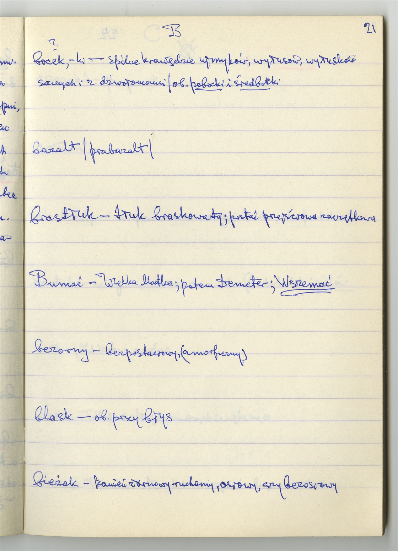 Rękopis słownika sporządzony w zeszycie w linię zatytułowany "Zumia stosowana Br. 1 A-J i D2 s. 1-120" - strona 18: hasła słownikowe na literę B c.d. (autorska strona 21)