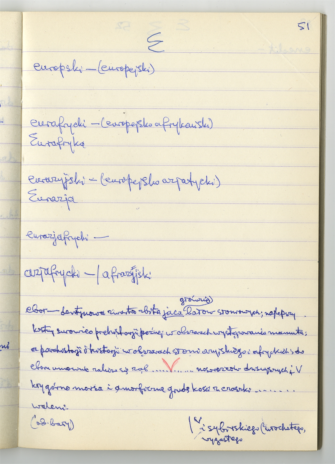 Rękopis słownika sporządzony w zeszycie w linię zatytułowany "Zumia stosowana Br. 1 A-J i D2 s. 1-120" - strona 45: hasła słownikowe na literę E (autorska strona 51)