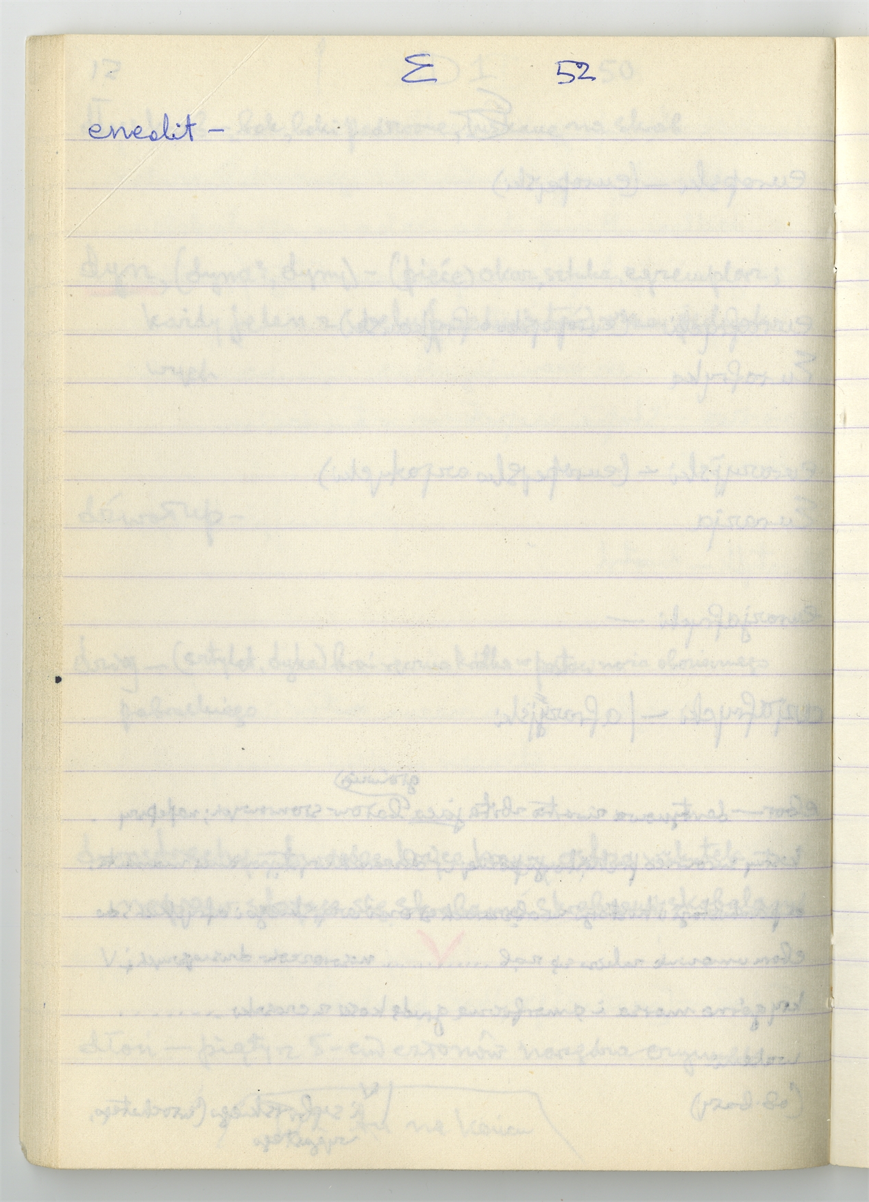 Rękopis słownika sporządzony w zeszycie w linię zatytułowany "Zumia stosowana Br. 1 A-J i D2 s. 1-120" - strona 46: hasła słownikowe na literę E c.d. (autorska strona 52)