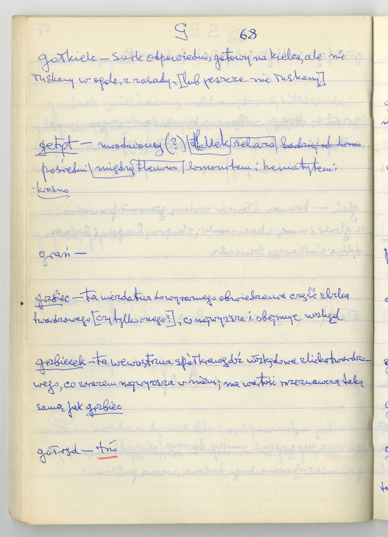 Rękopis słownika sporządzony w zeszycie w linię zatytułowany "Zumia stosowana Br. 1 A-J i D2 s. 1-120" - strona 51: hasła słownikowe na literę G c.d. (autorska strona 68)