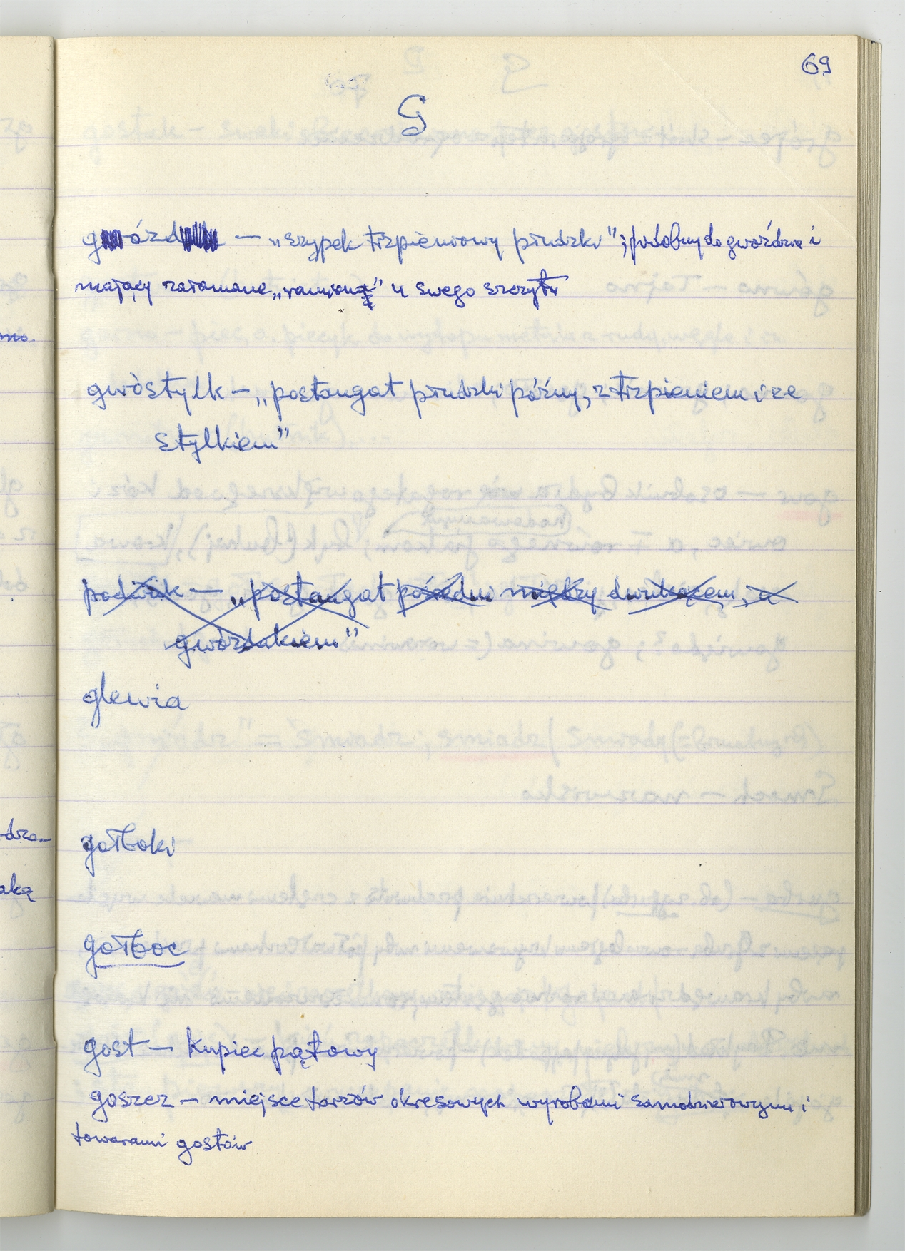 Element 52 - Rękopis słownika sporządzony w zeszycie w linię zatytułowany "Zumia stosowana Br. 1 A-J i D2 s. 1-120" - strona 52: hasła słownikowe na literę G c.d. (autorska strona 69)