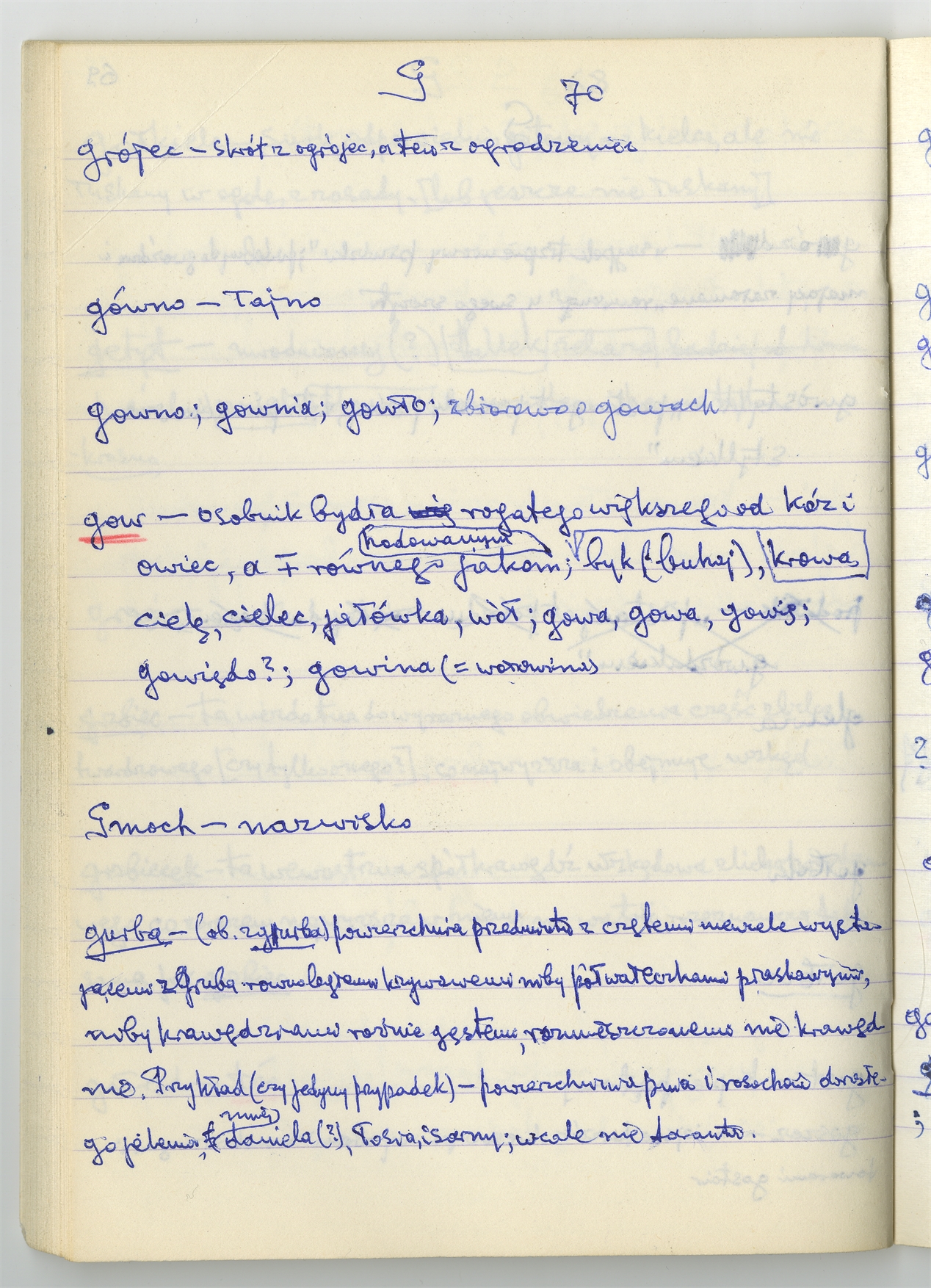 Rękopis słownika sporządzony w zeszycie w linię zatytułowany "Zumia stosowana Br. 1 A-J i D2 s. 1-120" - strona 53: hasła słownikowe na literę G c.d. (autorska strona 70)