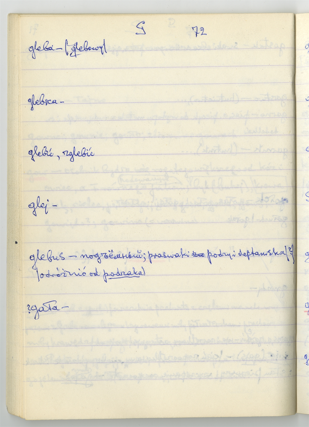 Rękopis słownika sporządzony w zeszycie w linię zatytułowany "Zumia stosowana Br. 1 A-J i D2 s. 1-120" - strona 55: hasła słownikowe na literę G c.d. (autorska strona 72)