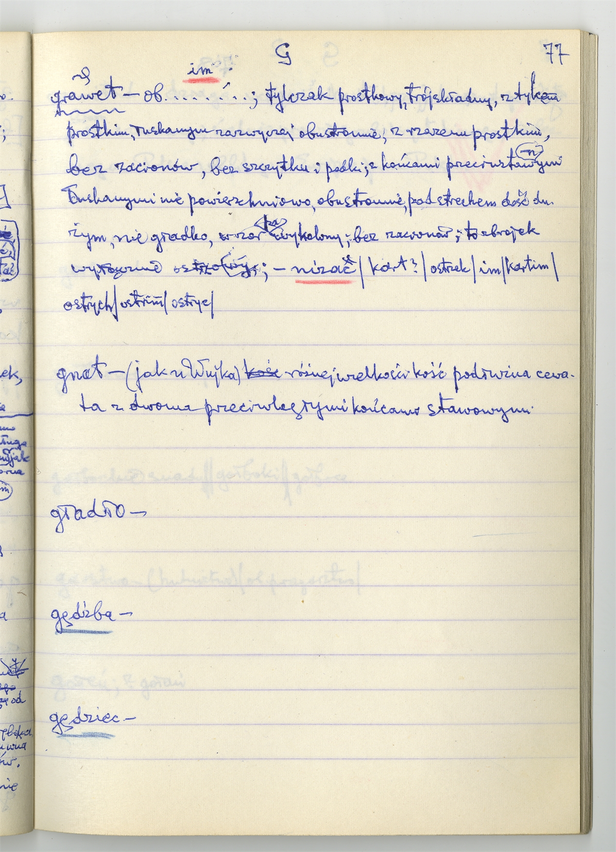 Rękopis słownika sporządzony w zeszycie w linię zatytułowany "Zumia stosowana Br. 1 A-J i D2 s. 1-120" - strona 60: hasła słownikowe na literę G c.d. (autorska strona 77)
