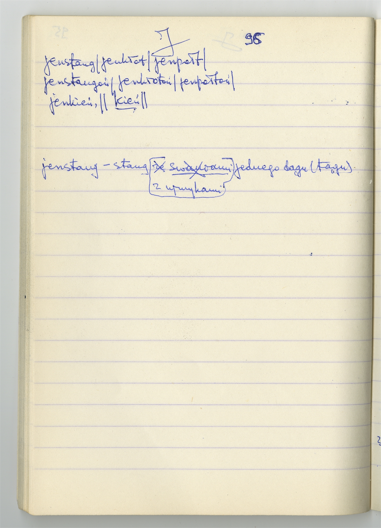 Rękopis słownika sporządzony w zeszycie w linię zatytułowany "Zumia stosowana Br. 1 A-J i D2 s. 1-120" - strona 66: hasła słownikowe na literę J (autorska strona 96)