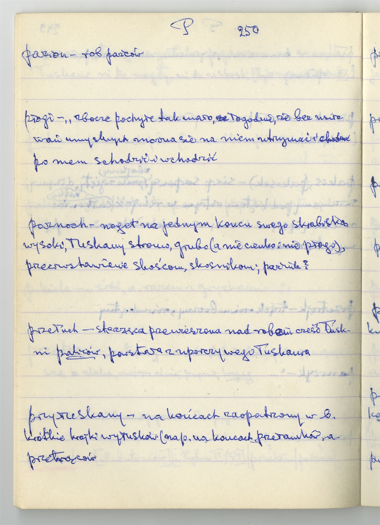 Rękopis słownika sporządzony w zeszycie w linię zatytułowany "Zumia stosowana P-R i S2 W2 Z2 s. 241-360" - strona 11: hasła słownikowe na literę P c.d. (autorska strona 250)