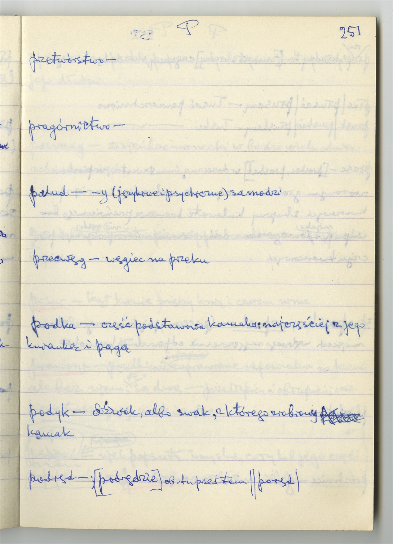 Rękopis słownika sporządzony w zeszycie w linię zatytułowany "Zumia stosowana P-R i S2 W2 Z2 s. 241-360" - strona 12: hasła słownikowe na literę P c.d. (autorska strona 251)