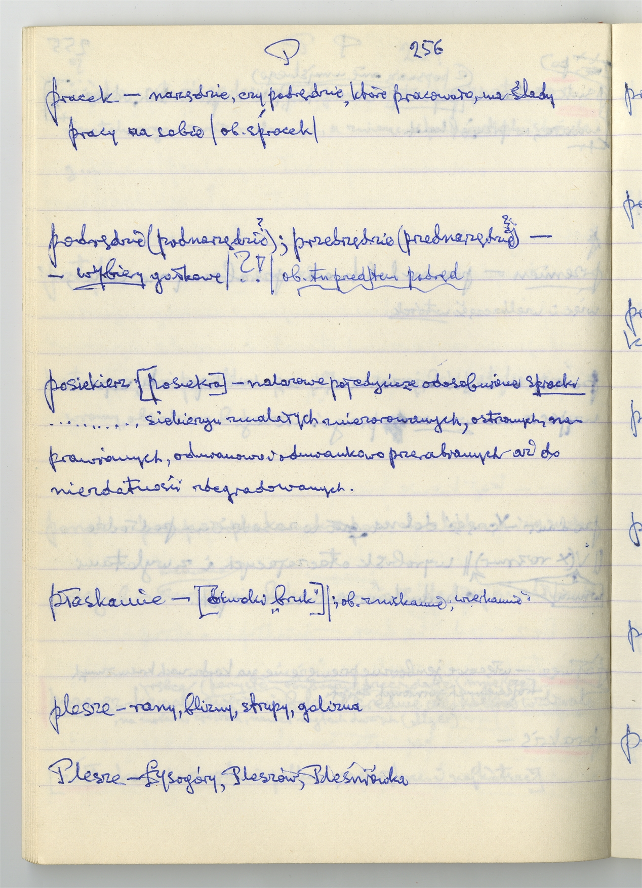 Rękopis słownika sporządzony w zeszycie w linię zatytułowany "Zumia stosowana P-R i S2 W2 Z2 s. 241-360" - strona 17: hasła słownikowe na literę P c.d. (autorska strona 256)