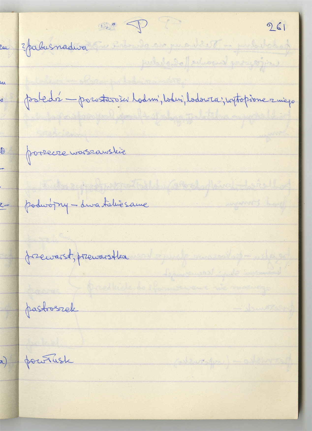 Rękopis słownika sporządzony w zeszycie w linię zatytułowany "Zumia stosowana P-R i S2 W2 Z2 s. 241-360" - strona 22: hasła słownikowe na literę P c.d. (autorska strona 261)