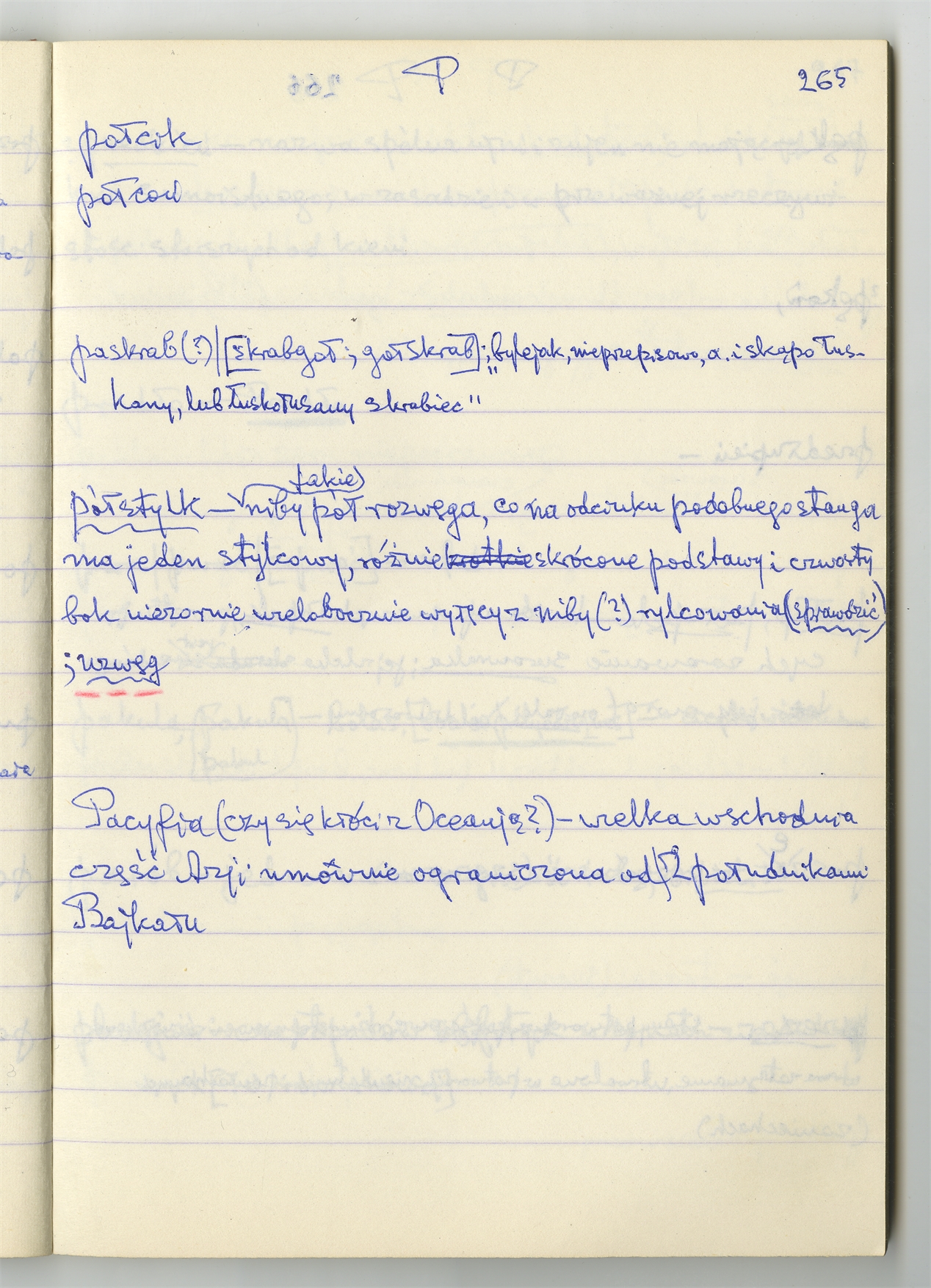 Rękopis słownika sporządzony w zeszycie w linię zatytułowany "Zumia stosowana P-R i S2 W2 Z2 s. 241-360" - strona 26: hasła słownikowe na literę P c.d. (autorska strona 265)