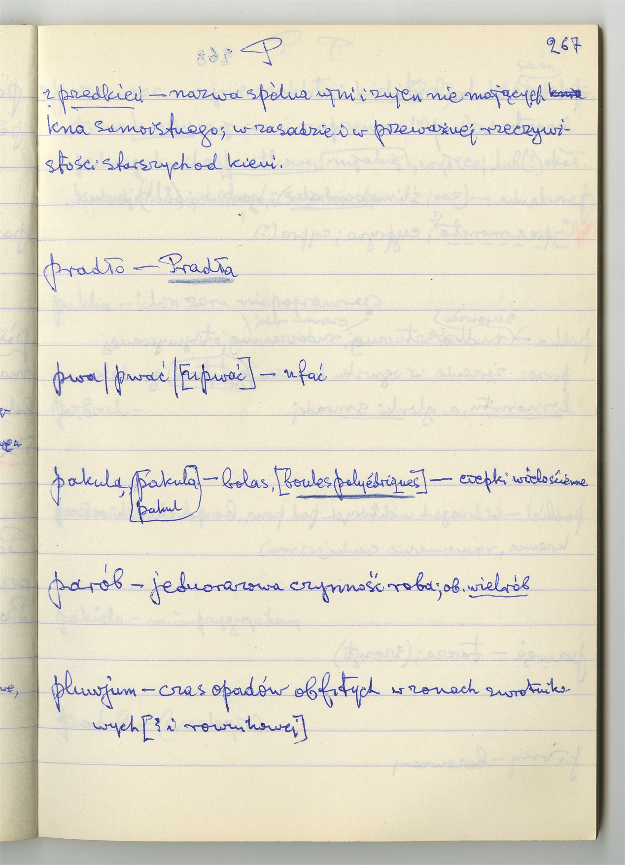 Rękopis słownika sporządzony w zeszycie w linię zatytułowany "Zumia stosowana P-R i S2 W2 Z2 s. 241-360" - strona 28: hasła słownikowe na literę P c.d. (autorska strona 267)