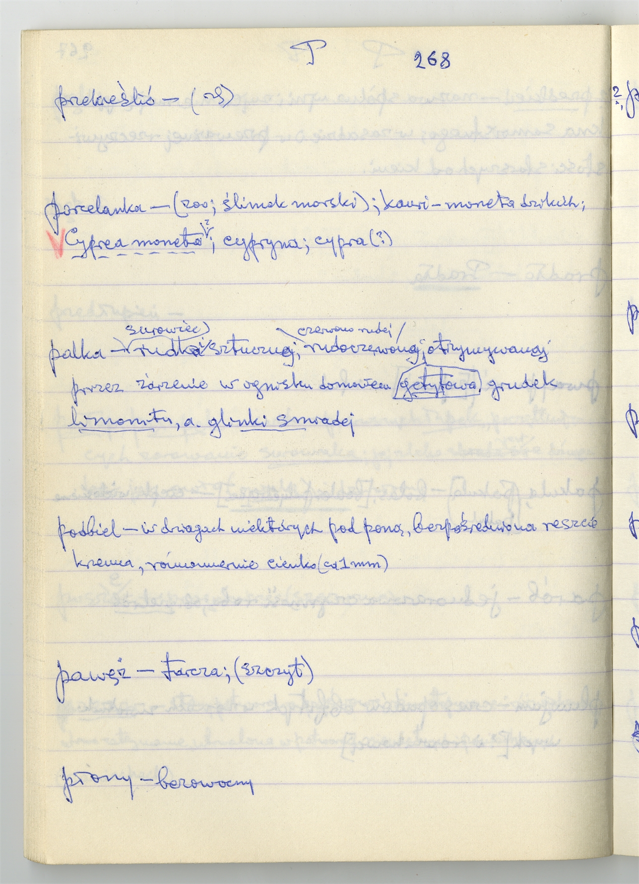 Rękopis słownika sporządzony w zeszycie w linię zatytułowany "Zumia stosowana P-R i S2 W2 Z2 s. 241-360" - strona 29: hasła słownikowe na literę P c.d. (autorska strona 268)