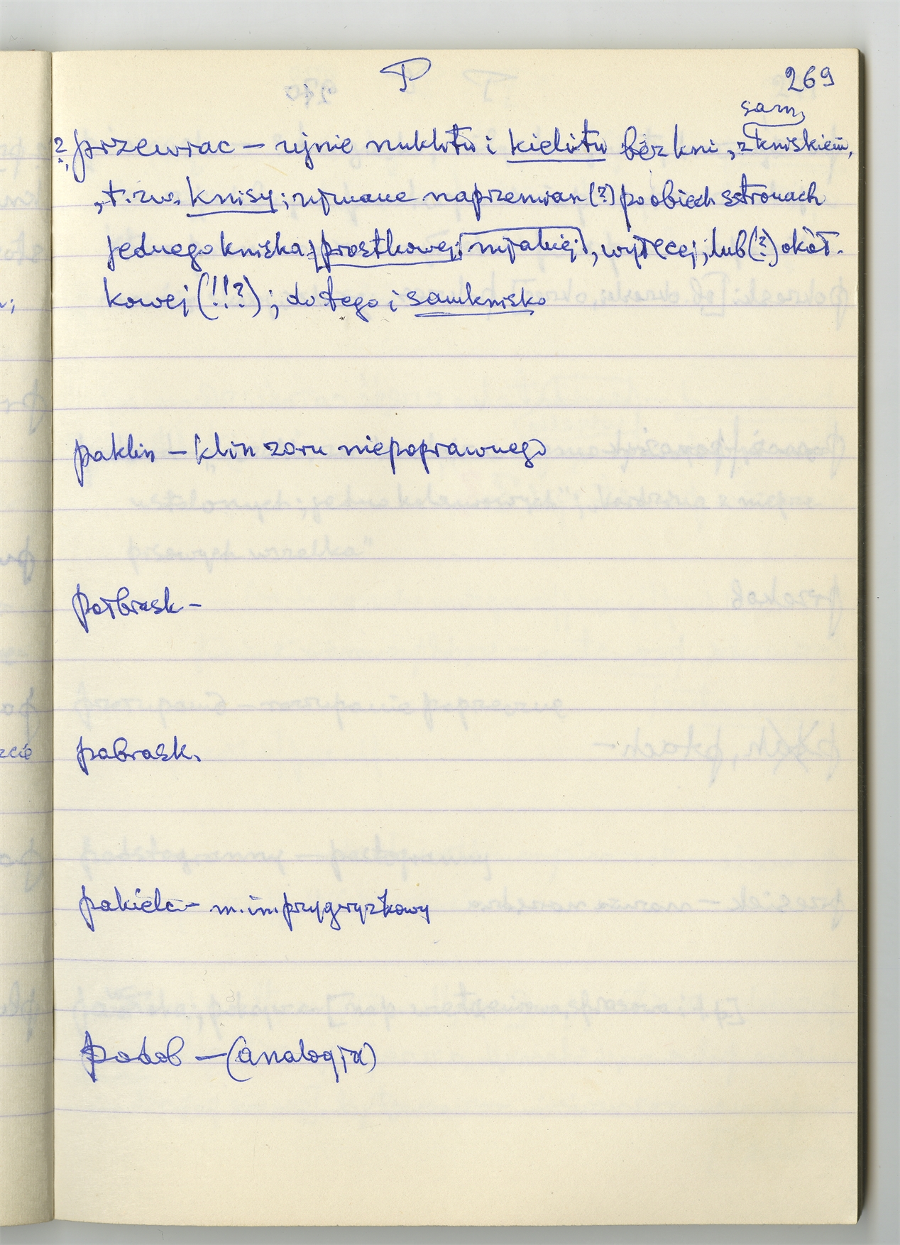 Rękopis słownika sporządzony w zeszycie w linię zatytułowany "Zumia stosowana P-R i S2 W2 Z2 s. 241-360" - strona 30: hasła słownikowe na literę P c.d. (autorska strona 269)