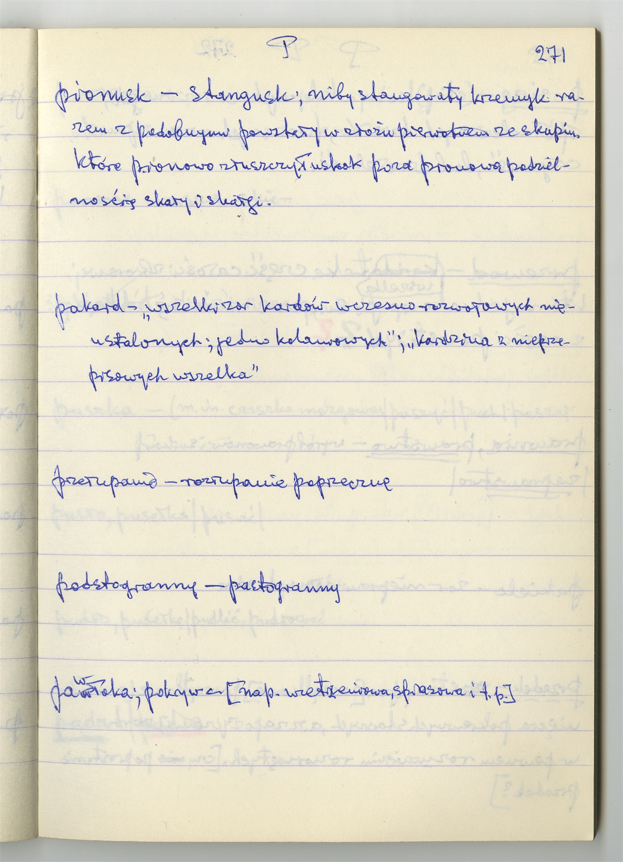 Rękopis słownika sporządzony w zeszycie w linię zatytułowany "Zumia stosowana P-R i S2 W2 Z2 s. 241-360" - strona 32: hasła słownikowe na literę P c.d. (autorska strona 271)