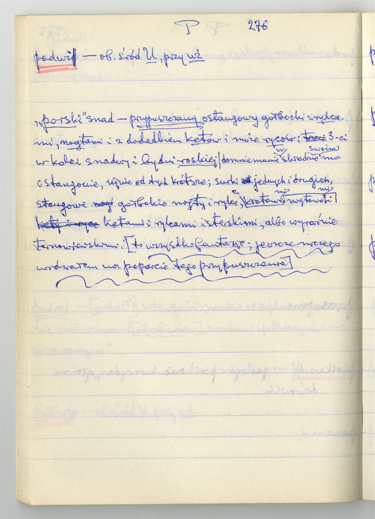 Rękopis słownika sporządzony w zeszycie w linię zatytułowany "Zumia stosowana P-R i S2 W2 Z2 s. 241-360" - strona 37: hasła słownikowe na literę P c.d. (autorska strona 276)