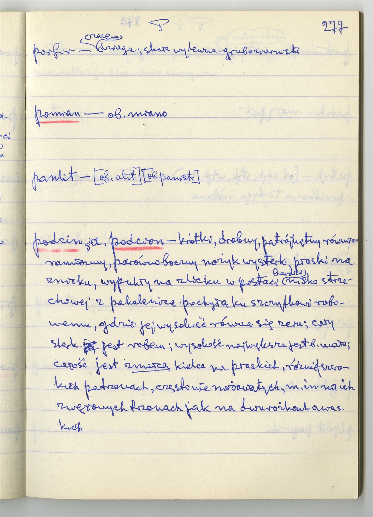 Rękopis słownika sporządzony w zeszycie w linię zatytułowany "Zumia stosowana P-R i S2 W2 Z2 s. 241-360" - strona 38: hasła słownikowe na literę P c.d. (autorska strona 277)