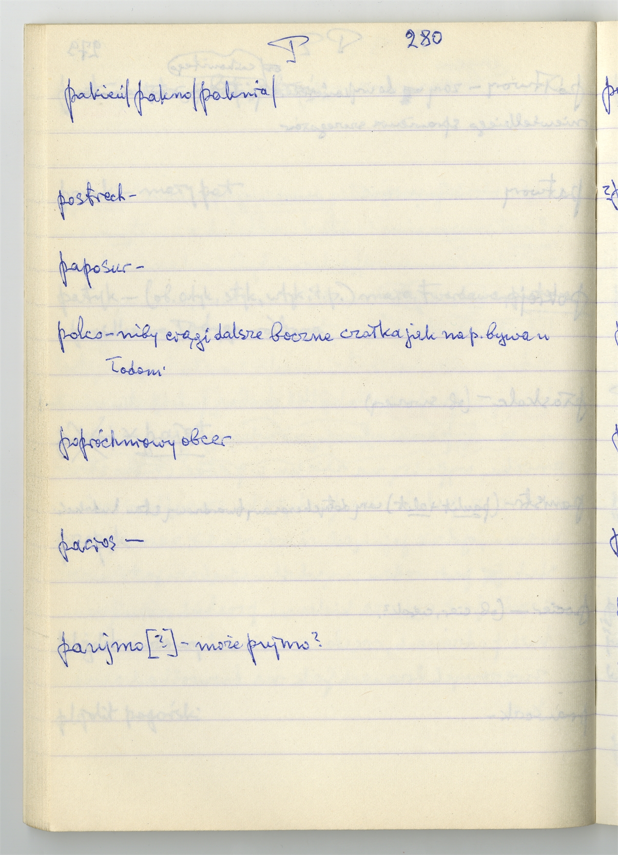 Rękopis słownika sporządzony w zeszycie w linię zatytułowany "Zumia stosowana P-R i S2 W2 Z2 s. 241-360" - strona 41: hasła słownikowe na literę P c.d. (autorska strona 280)