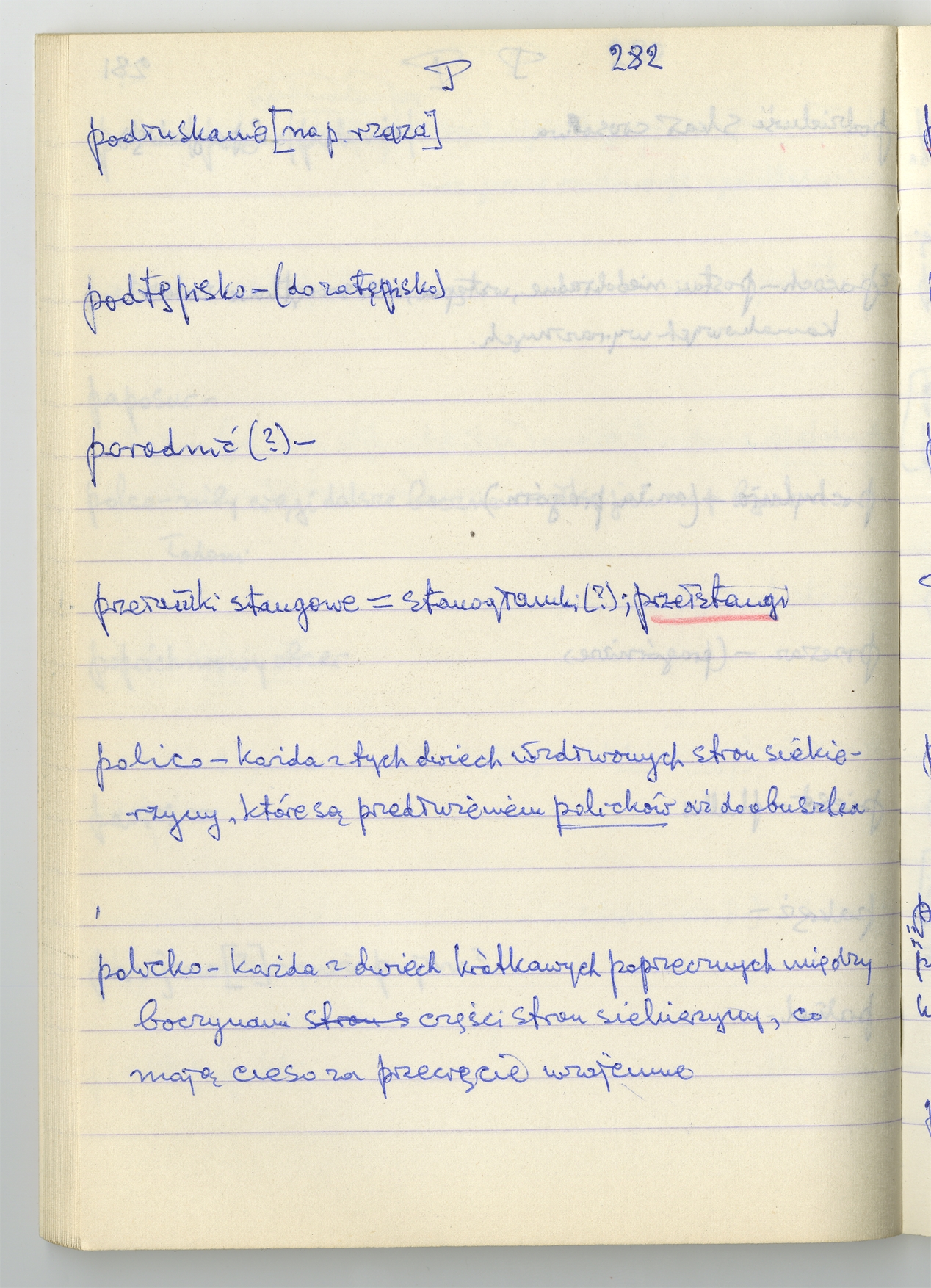 Rękopis słownika sporządzony w zeszycie w linię zatytułowany "Zumia stosowana P-R i S2 W2 Z2 s. 241-360" - strona 43: hasła słownikowe na literę P c.d. (autorska strona 282)
