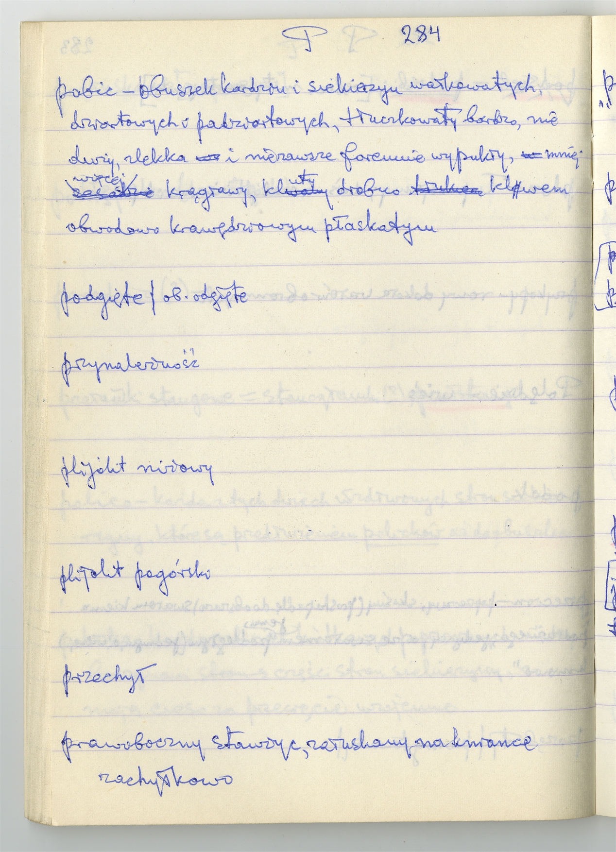 Rękopis słownika sporządzony w zeszycie w linię zatytułowany "Zumia stosowana P-R i S2 W2 Z2 s. 241-360" - strona 45: hasła słownikowe na literę P c.d. (autorska strona 284)