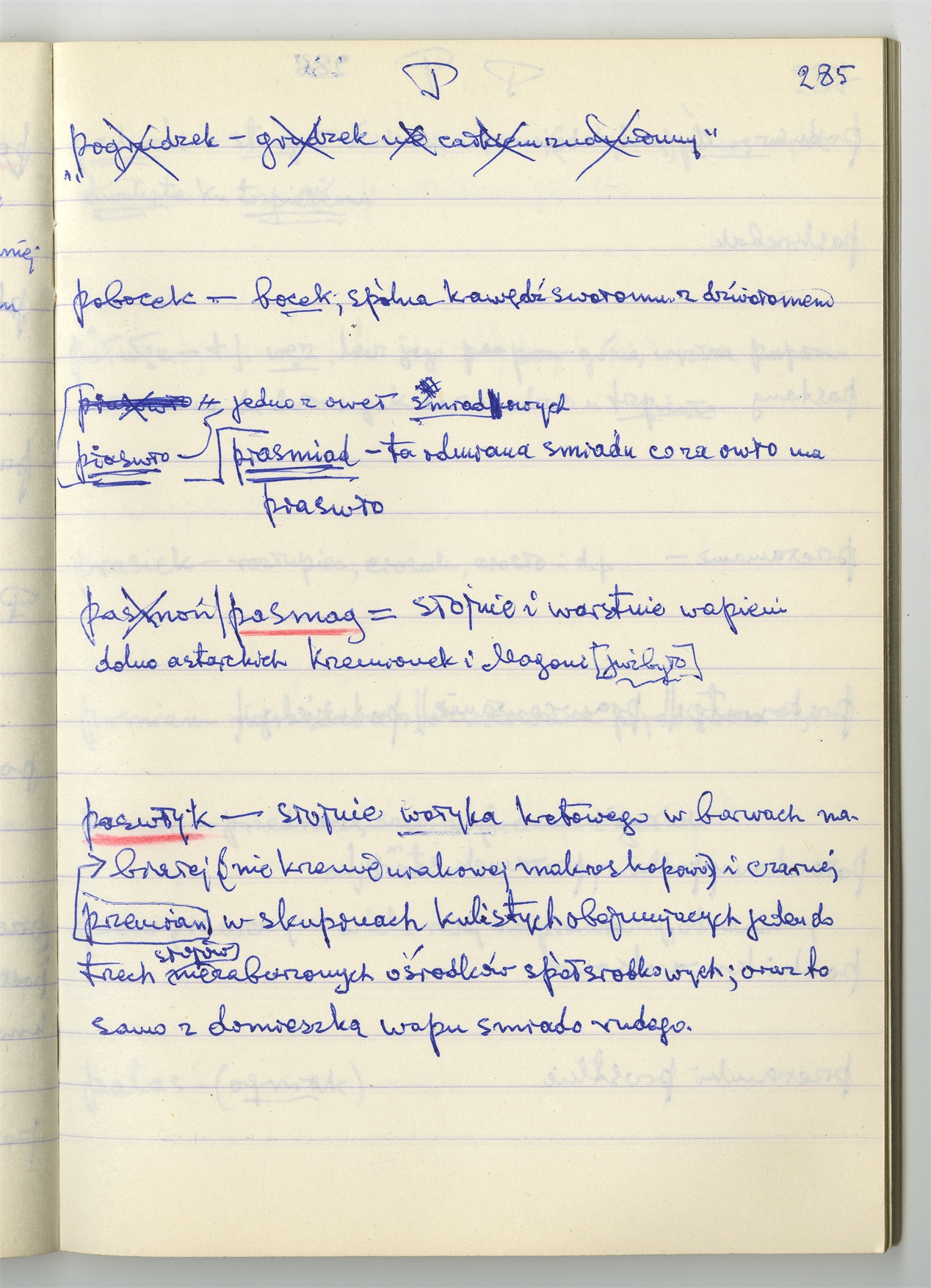 Rękopis słownika sporządzony w zeszycie w linię zatytułowany "Zumia stosowana P-R i S2 W2 Z2 s. 241-360" - strona 46: hasła słownikowe na literę P c.d. (autorska strona 285)