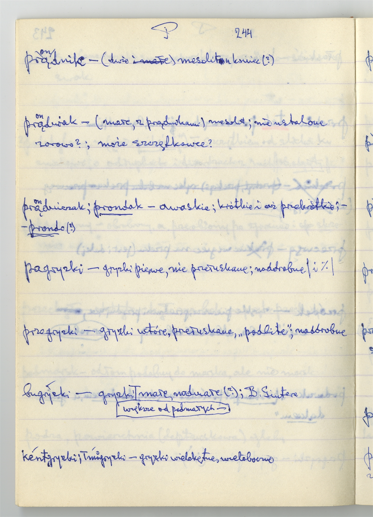 Rękopis słownika sporządzony w zeszycie w linię zatytułowany "Zumia stosowana P-R i S2 W2 Z2 s. 241-360" - strona 5: hasła słownikowe na literę P c.d. (autorska strona 244)