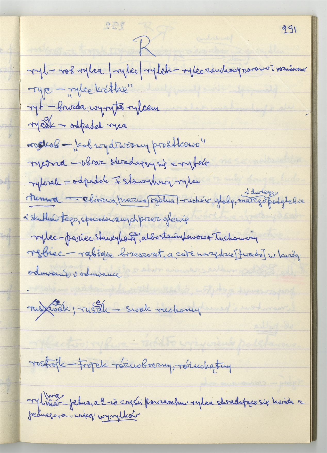 Rękopis słownika sporządzony w zeszycie w linię zatytułowany "Zumia stosowana P-R i S2 W2 Z2 s. 241-360" - strona 51: hasła słownikowe na literę R (autorska strona 291)