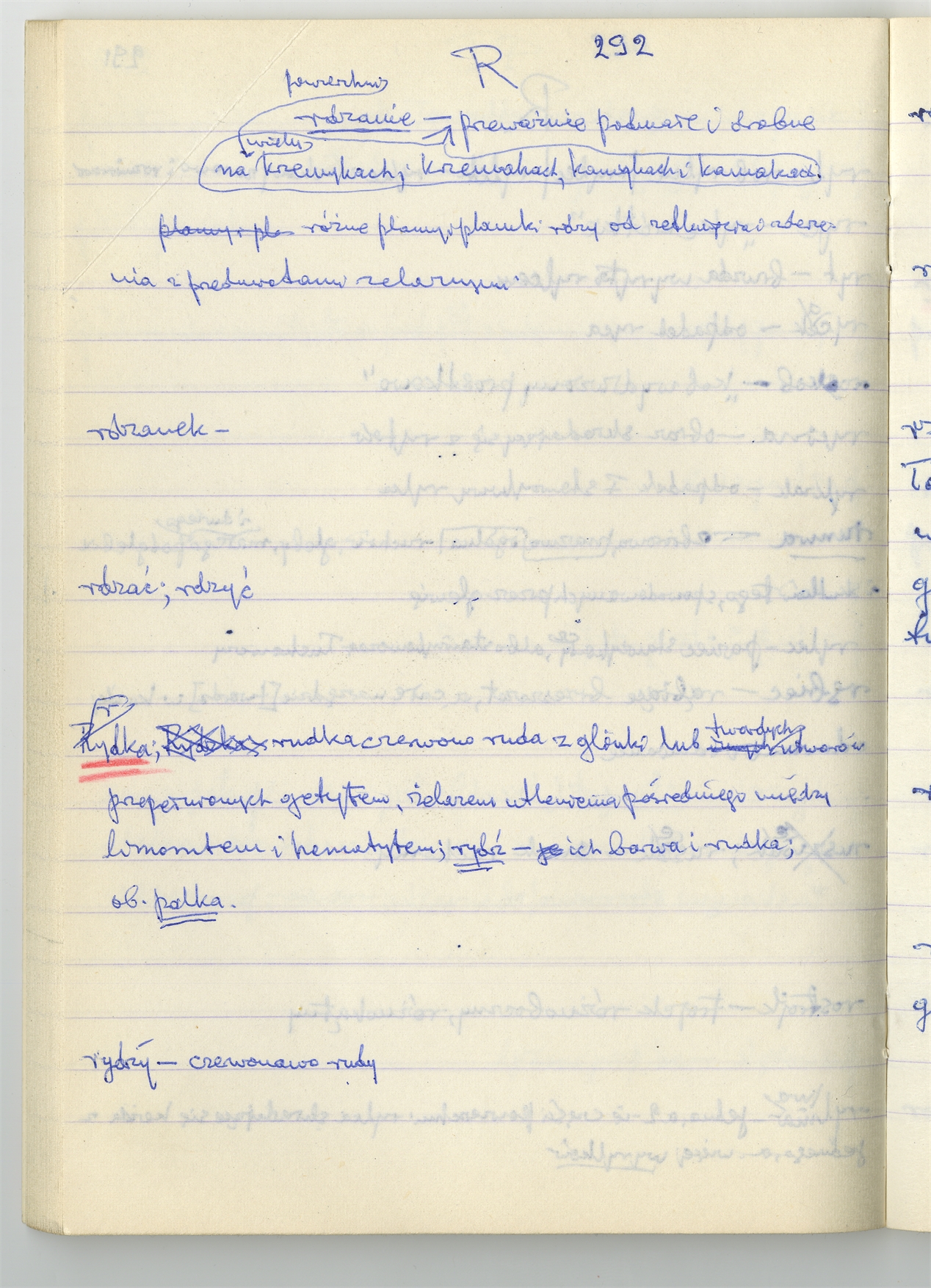 Rękopis słownika sporządzony w zeszycie w linię zatytułowany "Zumia stosowana P-R i S2 W2 Z2 s. 241-360" - strona 52: hasła słownikowe na literę R c.d. (autorska strona 292)