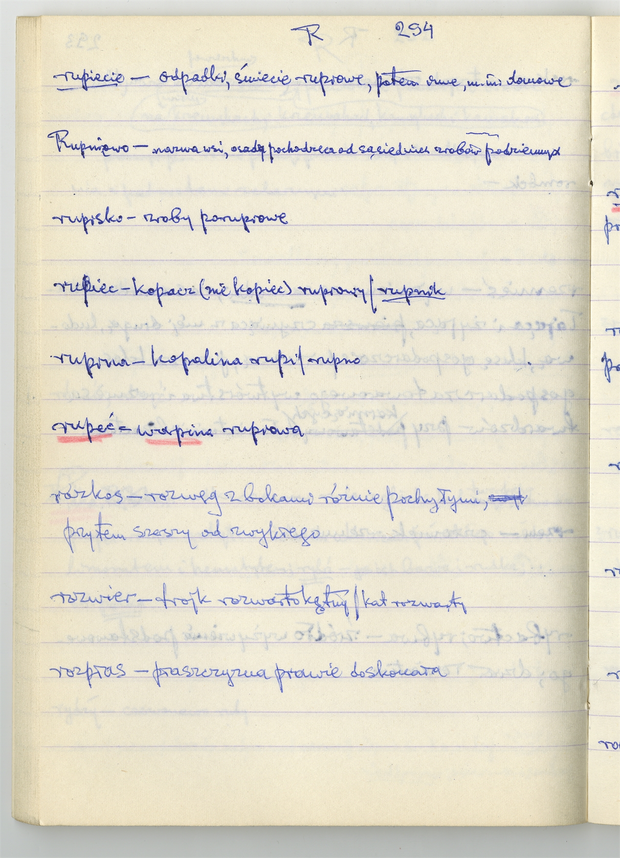 Rękopis słownika sporządzony w zeszycie w linię zatytułowany "Zumia stosowana P-R i S2 W2 Z2 s. 241-360" - strona 54: hasła słownikowe na literę R c.d. (autorska strona 294)