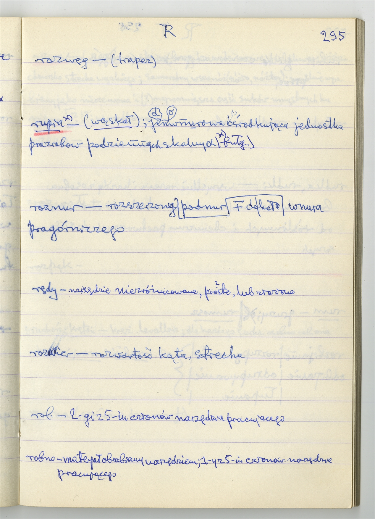 Rękopis słownika sporządzony w zeszycie w linię zatytułowany "Zumia stosowana P-R i S2 W2 Z2 s. 241-360" - strona 55: hasła słownikowe na literę R c.d. (autorska strona 295)