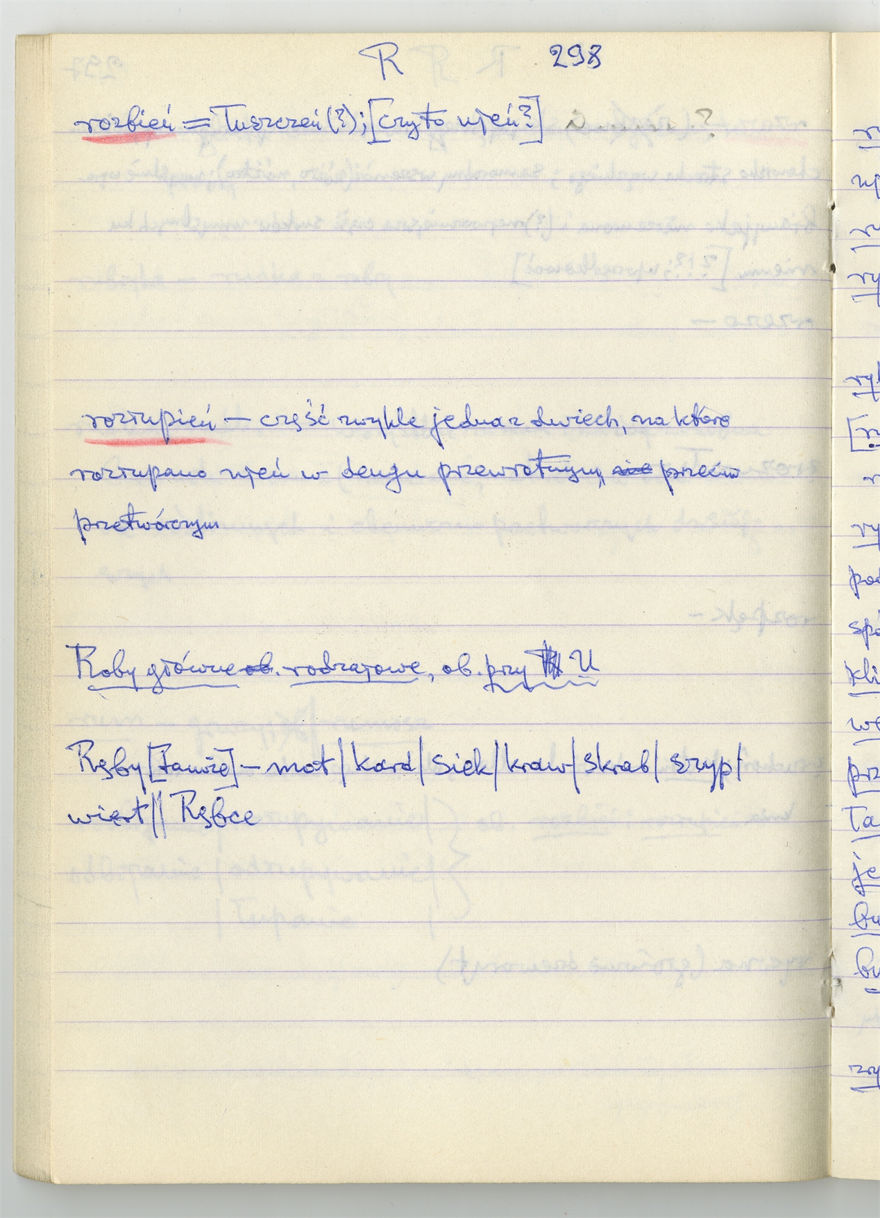 Rękopis słownika sporządzony w zeszycie w linię zatytułowany "Zumia stosowana P-R i S2 W2 Z2 s. 241-360" - strona 58: hasła słownikowe na literę R c.d. (autorska strona 298)