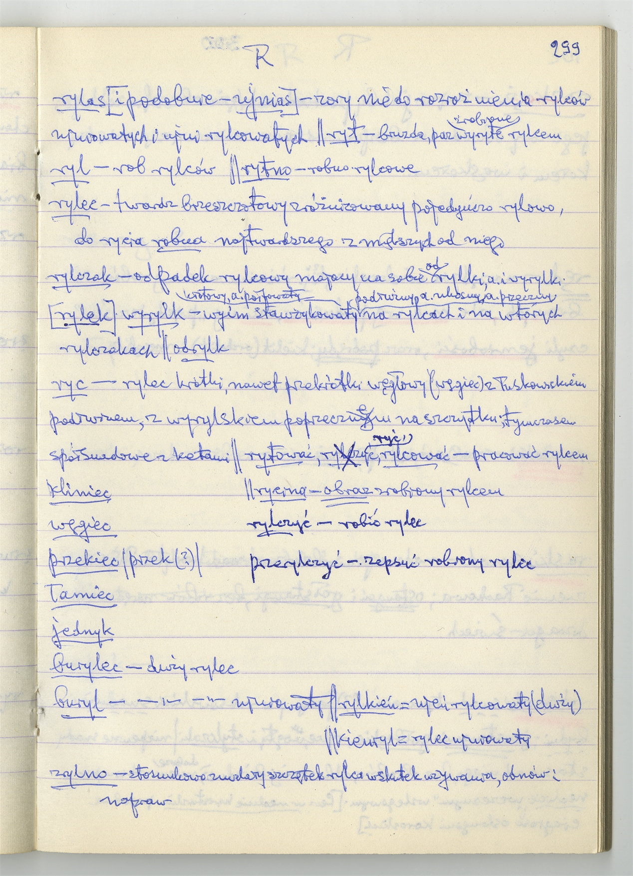 Rękopis słownika sporządzony w zeszycie w linię zatytułowany "Zumia stosowana P-R i S2 W2 Z2 s. 241-360" - strona 59: hasła słownikowe na literę R c.d. (autorska strona 299)