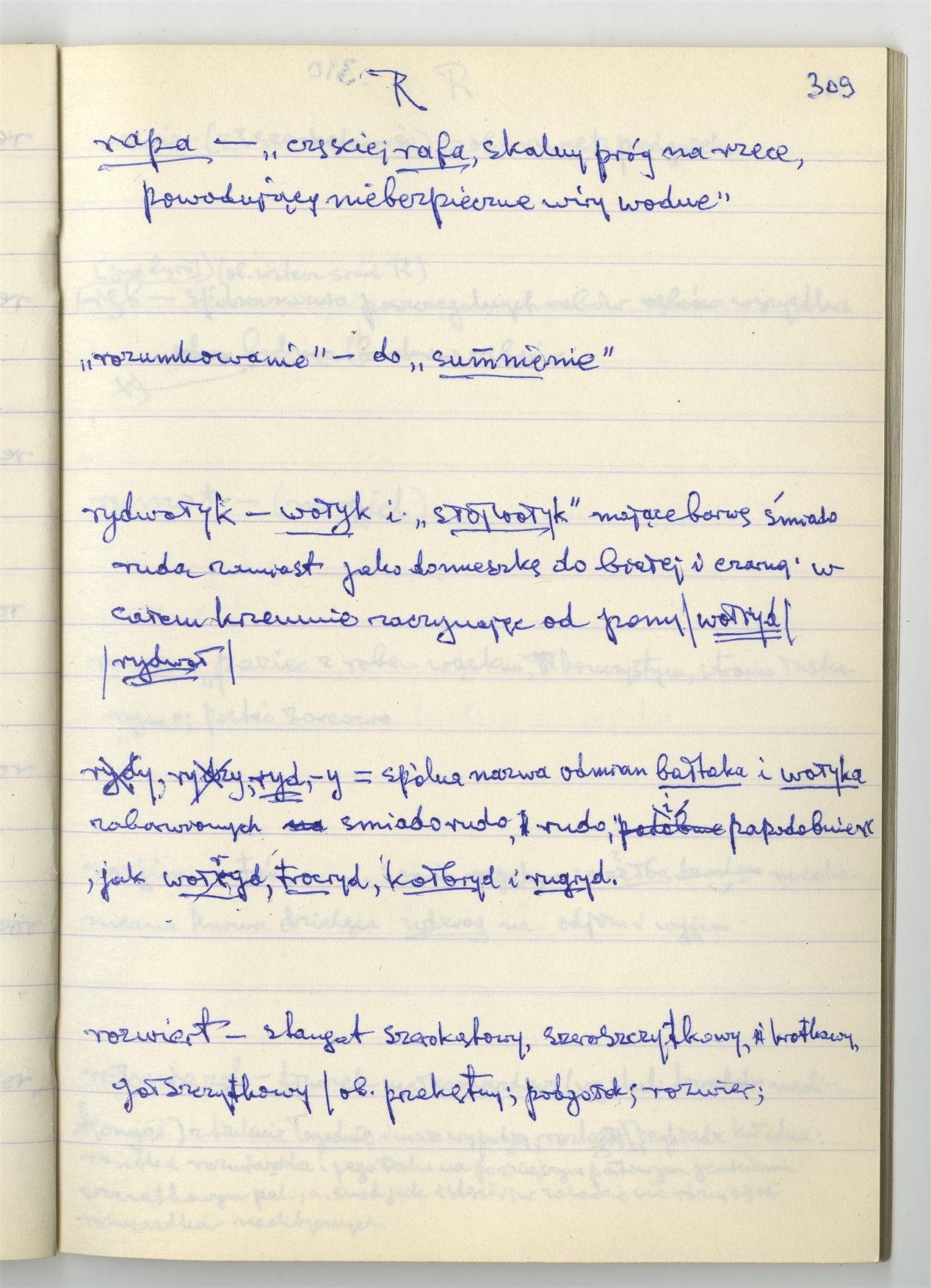 Rękopis słownika sporządzony w zeszycie w linię zatytułowany "Zumia stosowana P-R i S2 W2 Z2 s. 241-360" - strona 66: hasła słownikowe na literę R c.d. (autorska strona 309)