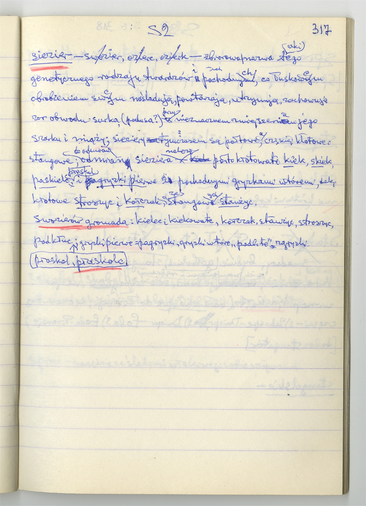 Rękopis słownika sporządzony w zeszycie w linię zatytułowany "Zumia stosowana P-R i S2 W2 Z2 s. 241-360" - strona 69: hasła słownikowe na literę S(2) (autorska strona 317)