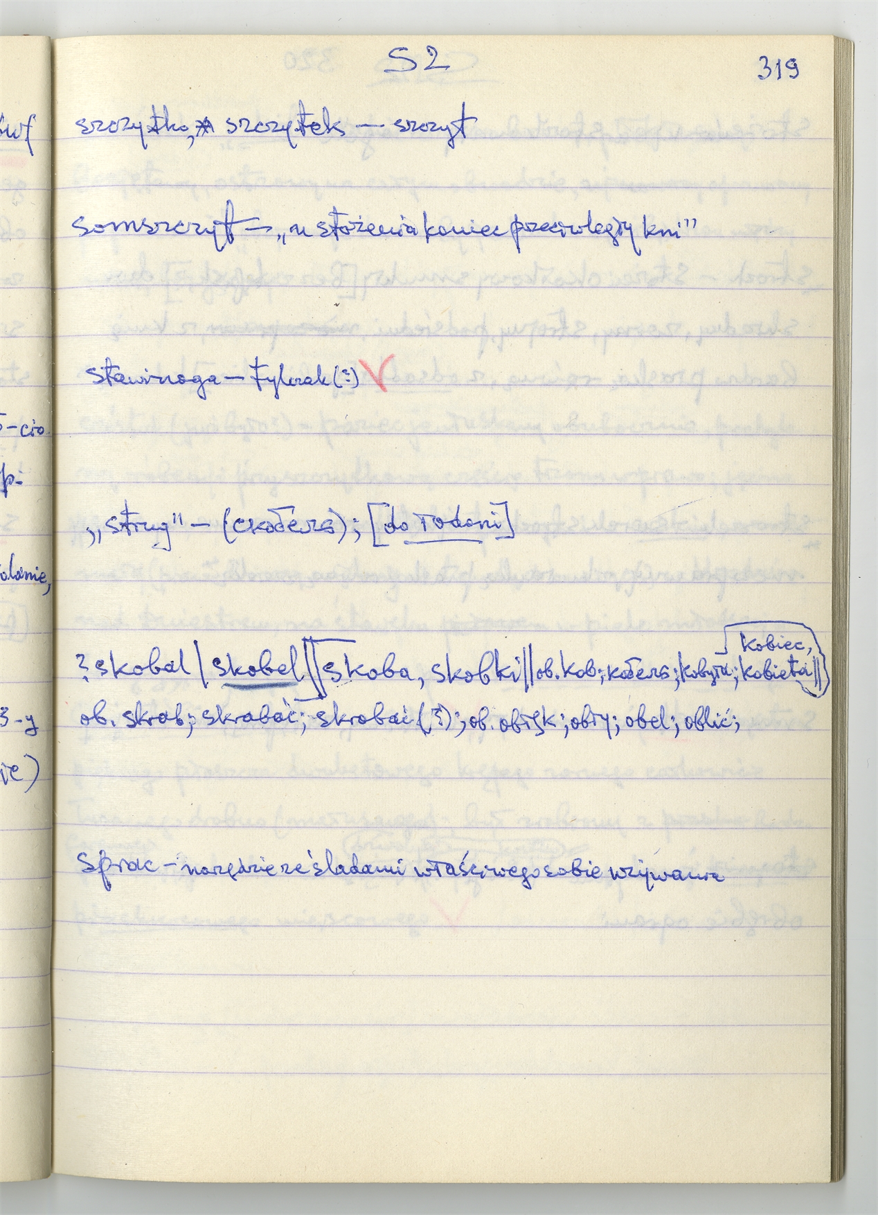 Rękopis słownika sporządzony w zeszycie w linię zatytułowany "Zumia stosowana P-R i S2 W2 Z2 s. 241-360" - strona 71: hasła słownikowe na literę S(2) c.d. (autorska strona 319)