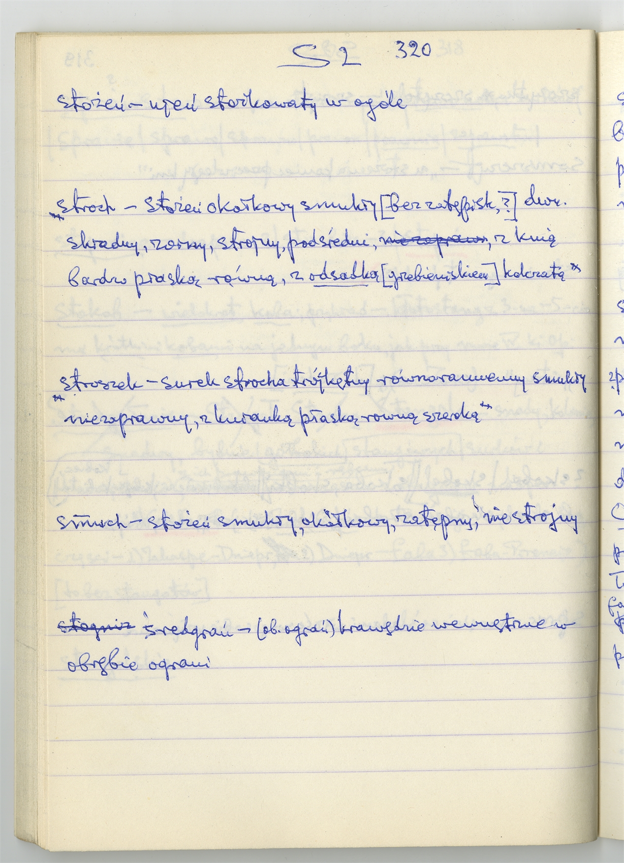 Rękopis słownika sporządzony w zeszycie w linię zatytułowany "Zumia stosowana P-R i S2 W2 Z2 s. 241-360" - strona 72: hasła słownikowe na literę S(2) c.d. (autorska strona 320)
