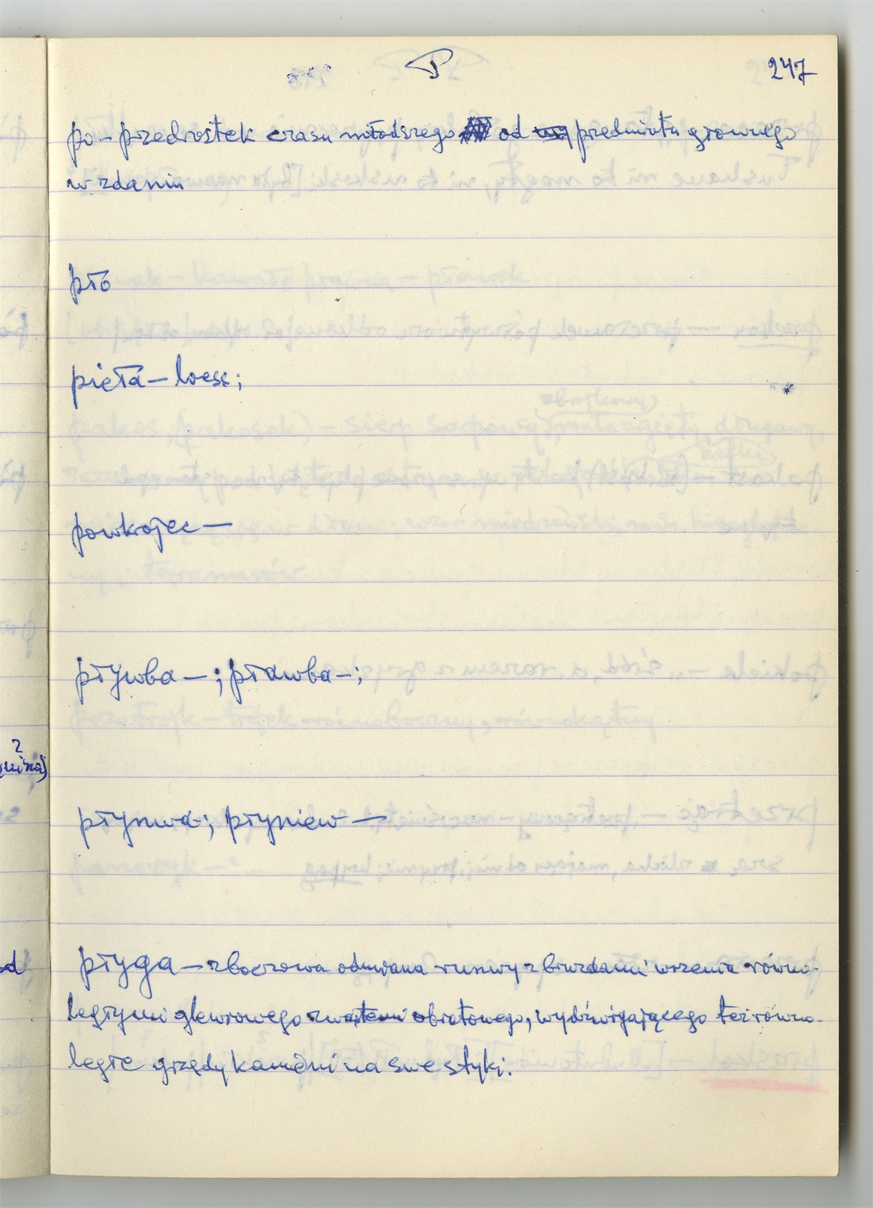 Rękopis słownika sporządzony w zeszycie w linię zatytułowany "Zumia stosowana P-R i S2 W2 Z2 s. 241-360" - strona 8: hasła słownikowe na literę P c.d. (autorska strona 247)