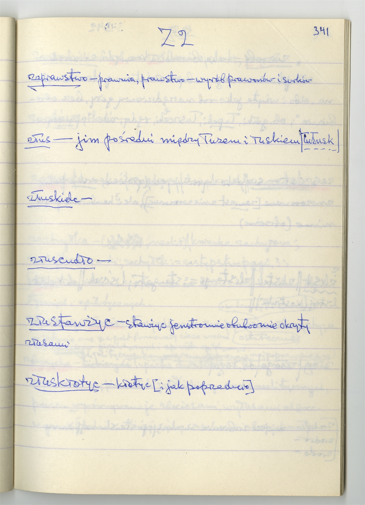 Rękopis słownika sporządzony w zeszycie w linię zatytułowany "Zumia stosowana P-R i S2 W2 Z2 s. 241-360" - strona 81: hasła słownikowe na literę Z(2) (autorska strona 341)