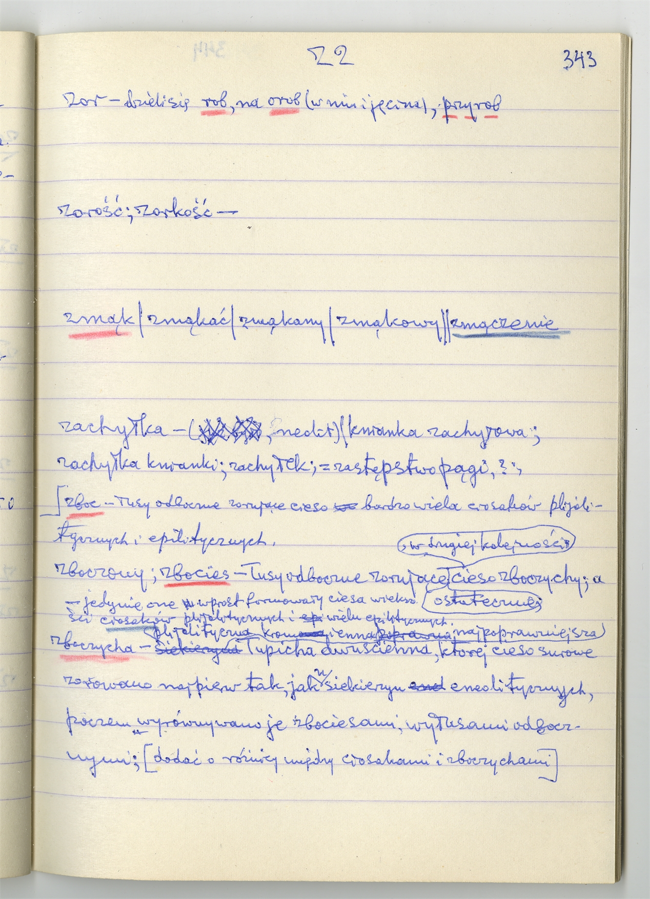 Rękopis słownika sporządzony w zeszycie w linię zatytułowany "Zumia stosowana P-R i S2 W2 Z2 s. 241-360" - strona 83: hasła słownikowe na literę Z(2) c.d. (autorska strona 343)